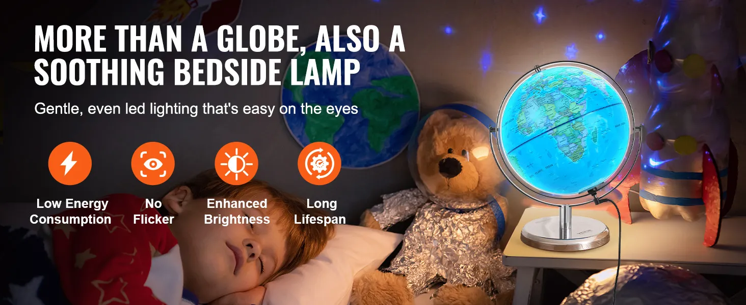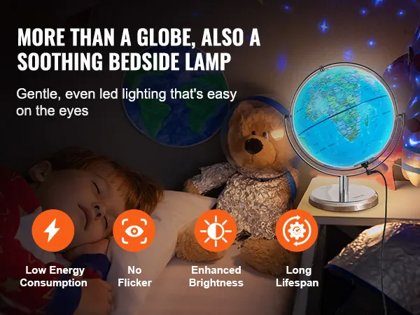 De LED-verlichtingsfunctie van de VEVOR-globe voegt een magische touch toe. Wanneer ingeschakeld, licht de globe op om de sterrenbeelden te onthullen. Dit creëert een interessante en meeslepende leeromgeving. Het zachte LED-licht is niet alleen educatief, maar ook rustgevend. Het moedigt kinderen aan om de nachtelijke hemel te verkennen en erover te leren. Dankzij deze functie helpt het bij het opwekken van nieuwsgierigheid en interesse in astronomie. Bovendien kan het dienen als een decoratief element in elke kamer.