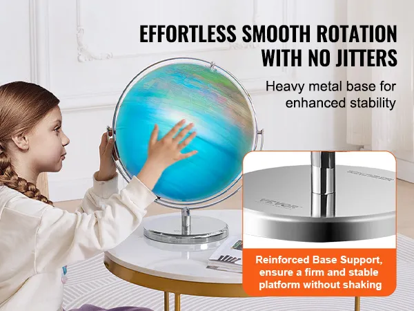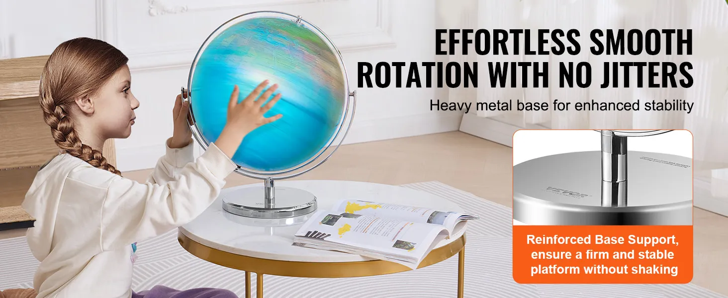 De VEVOR globe heeft een stabiele, zware metalen basis. Dit zorgt ervoor dat de globe stevig blijft staan tijdens gebruik. De sterke basis draagt bij aan de duurzaamheid van het product. Het kan de ontberingen van dagelijks gebruik weerstaan, vooral door kinderen. De metalen basis geeft de globe ook een premium look en feel. Daarom is het ook een decoratief stuk. De stabiliteit van deze basis zorgt ervoor dat de globe soepel draait. Deze eigenschap is cruciaal voor de gebruikerservaring. Duurzame constructie garandeert dat onze globe jarenlang meegaat.