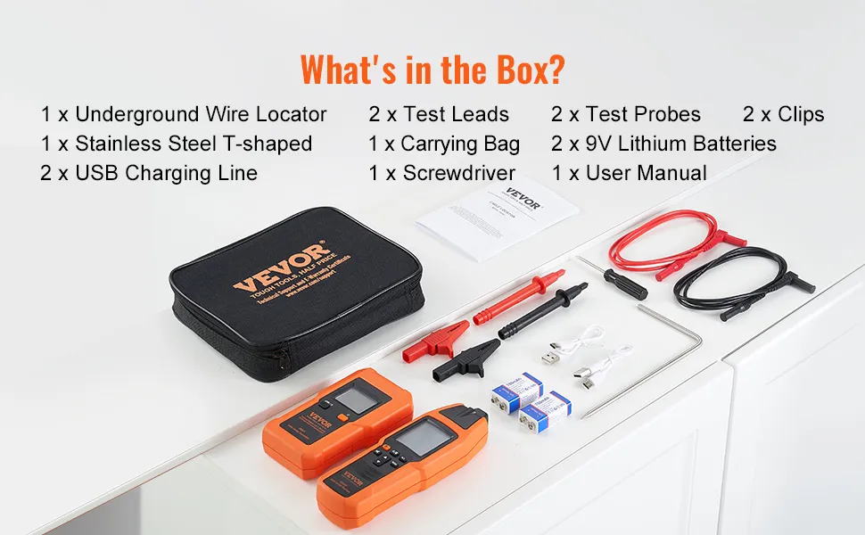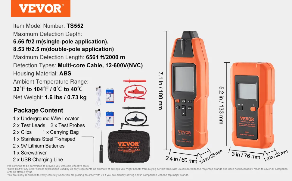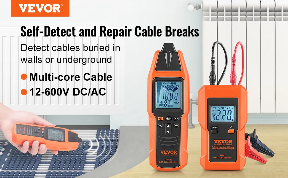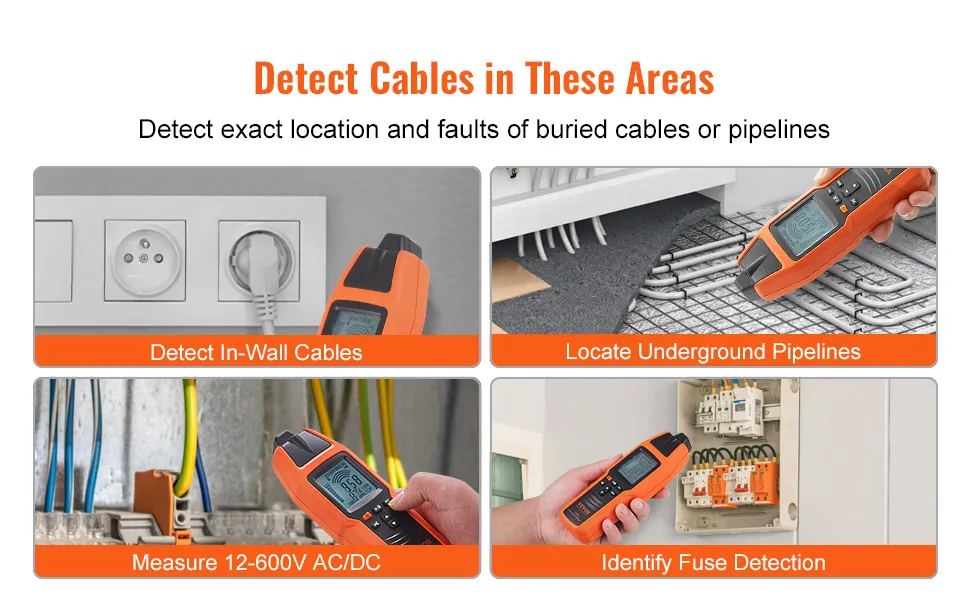Deze VEVOR ondergrondse kabelzoeker heeft een maximale detectiediepte van 8,5 ft, waardoor hij ideaal is voor diepe kabeldetectietaken. Hij heeft ook een maximaal bereik van 6561 ft, wat zorgt voor dekking over lange afstanden. Deze breukdetectorzoeker biedt contactloze spanningsmeting (NCV), wat zorgt voor veilige inspecties. U kunt het elektromagnetische veld meten zonder draden aan te raken. Deze tool is geschikt voor een breed scala aan kabeldetectietaken, of het nu gaat om breukdetectie of algemene kabeltracering. De breukdetectorzoeker is gebouwd om onder verschillende omstandigheden te presteren en levert consistent betrouwbare resultaten bij kabeltracering.