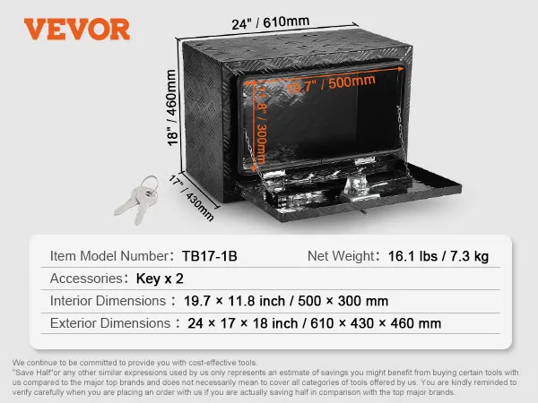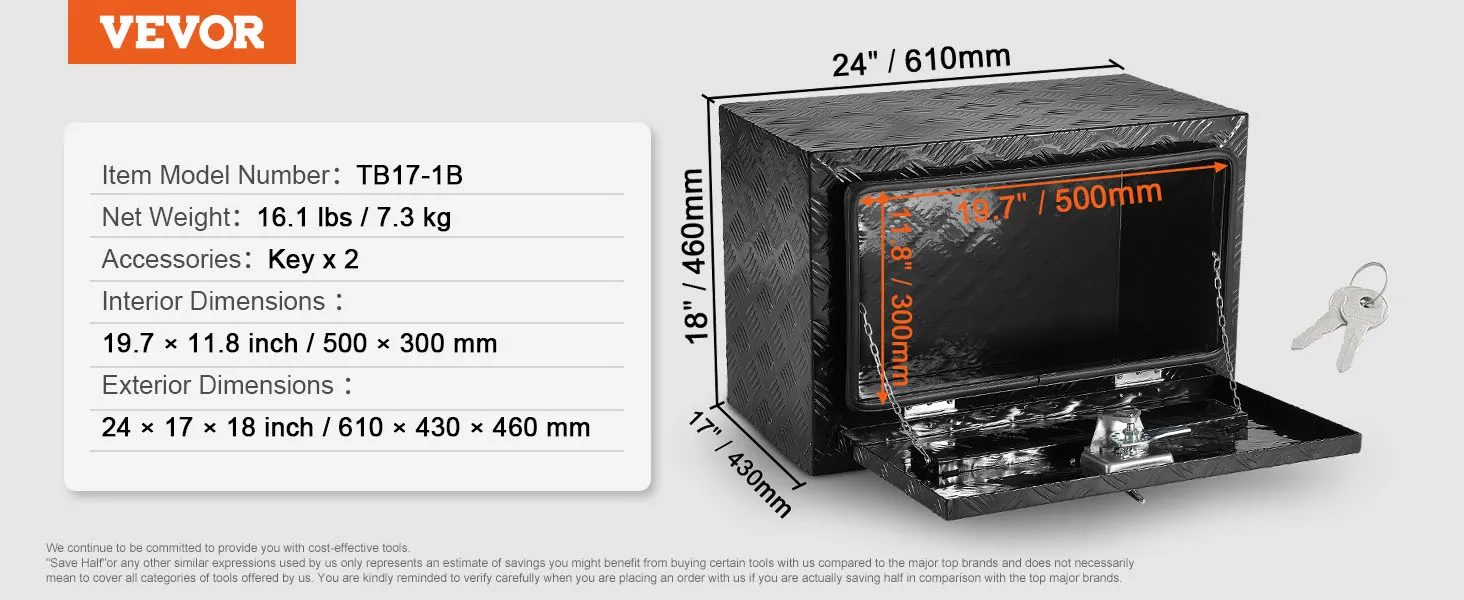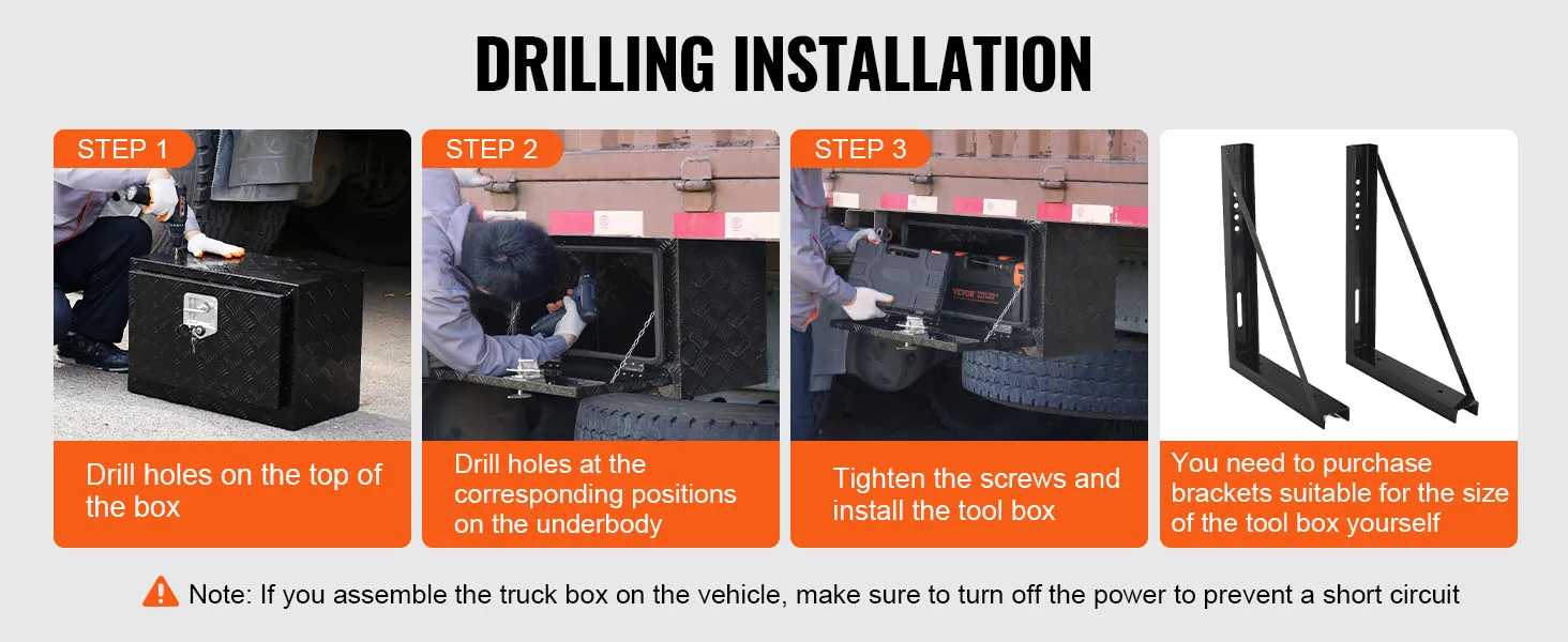 In een handomdraai in elkaar gezet: deze vrachtwagendoos meet 610 x 430 x 460 mm (24 x 17 x 18 inch). Zorg er daarom voor dat u vóór de aankoop de bodemruimte van uw voertuig meet. VEVOR biedt verschillende maten om aan uw behoeften te voldoen. U kunt ook beugels kopen voor montage of de montage zelf doen. Houd er rekening mee dat bij het installeren van de vrachtwagenbox op het voertuig de stroom moet worden uitgeschakeld om kortsluiting te voorkomen.