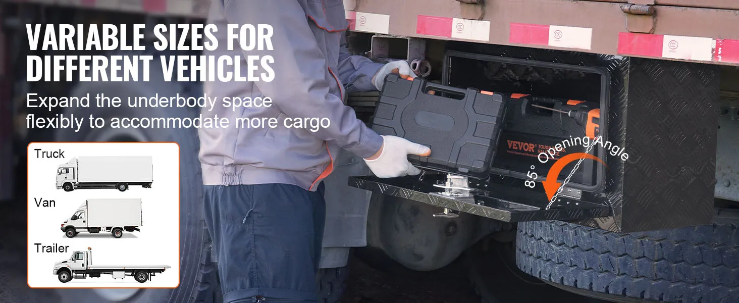 De VEVOR gereedschapskist onder de vloer breidt de opslagruimte van uw vrachtwagen, aanhanger of ander groot voertuig uit. Van onderhoudsgereedschap tot kampeerspullen, in deze vrachtwagenkist berg je alles netjes op.