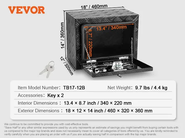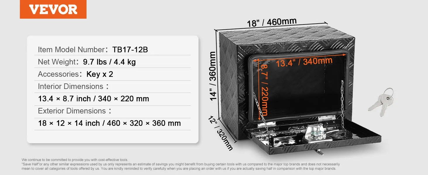 Install In No Time: This underbody truck box measures 18 x 12 x 14 inch/460 x 320 x 360 mm, so make sure to measure your vehicle's underbody space before purchasing. VEVOR provides a variety of dimensions to meet your needs. You can also purchase brackets to install or do a DIY assembly yourself. Note that if you assemble the truck box on the vehicle, make sure to turn off the power to prevent a short circuit.