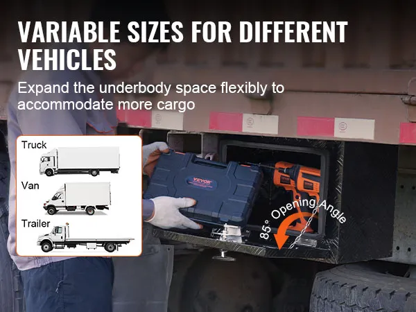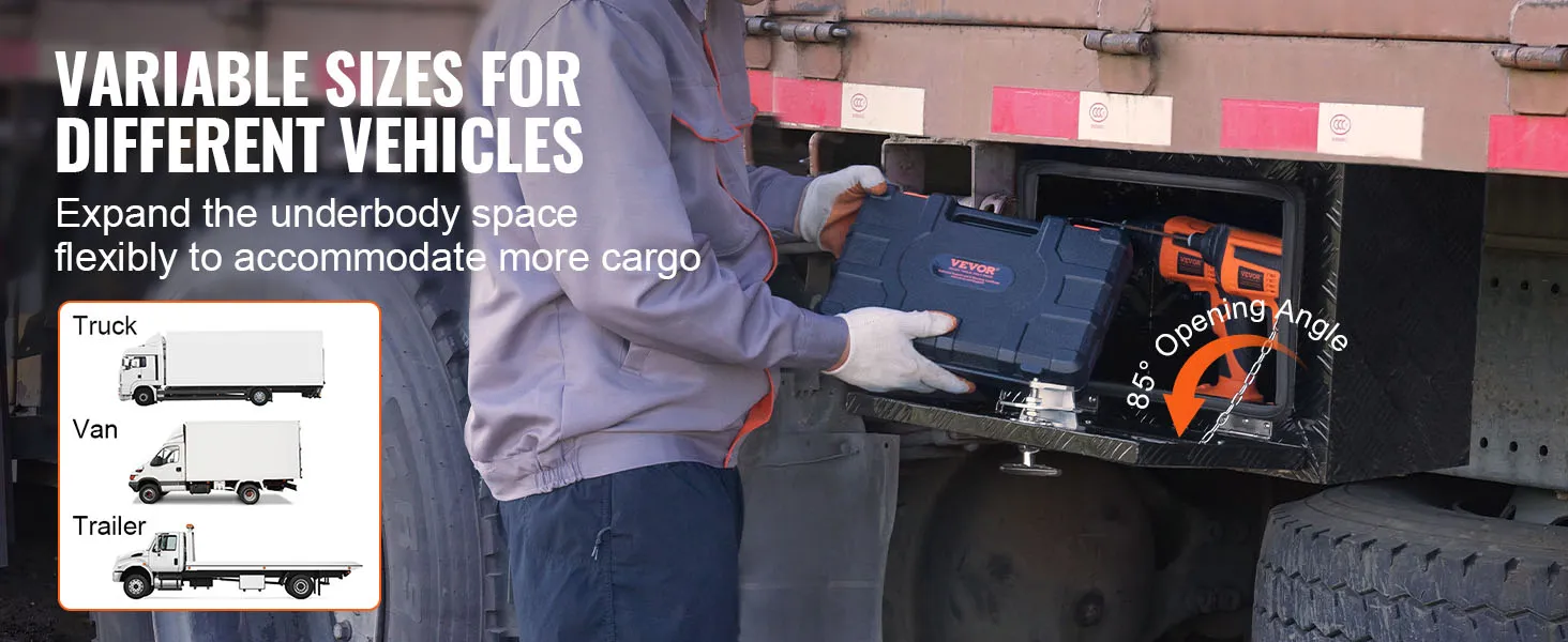 Are your items organized and easily accessible? VEVOR's underbody toolbox expands the storage space of your truck, trailer, or other large vehicles. You can store all your needs, from maintenance tools to camping equipment, in this truck box and keep everything organized.