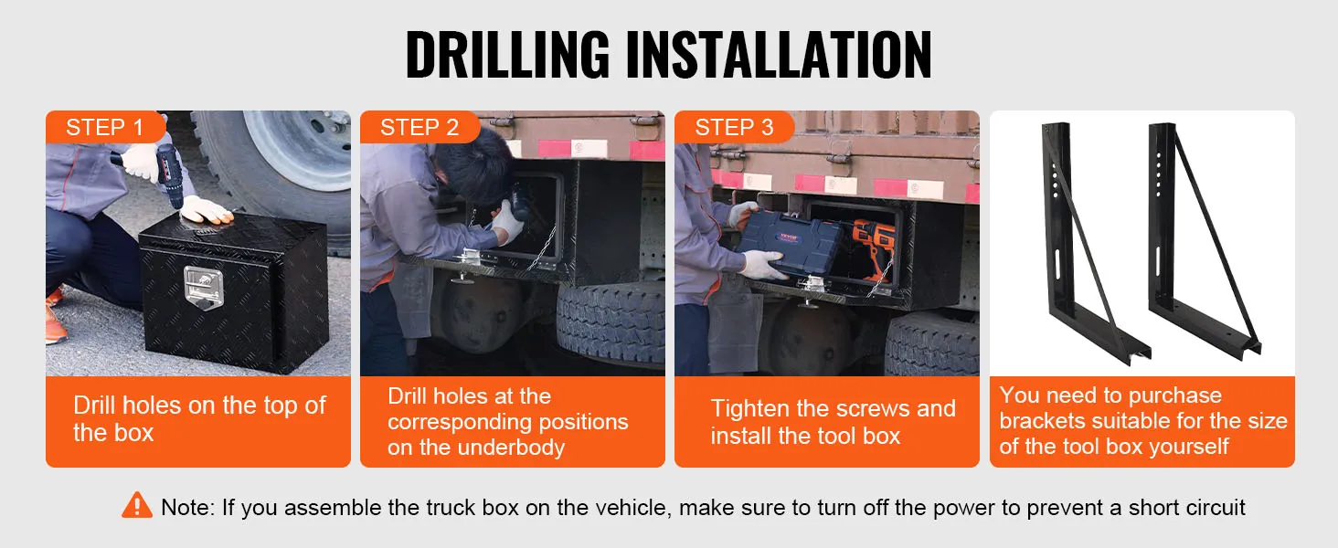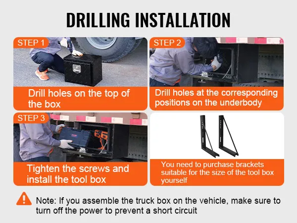 Before purchase, measure the space under your vehicle to choose from various sizes that meet your needs. You can purchase brackets for installation or assemble it yourself (DIY). Note that if you assemble the truck box on the vehicle, make sure to turn off the power to prevent a short circuit.