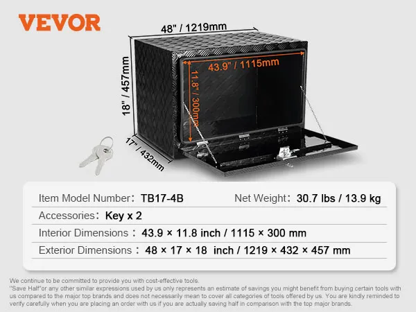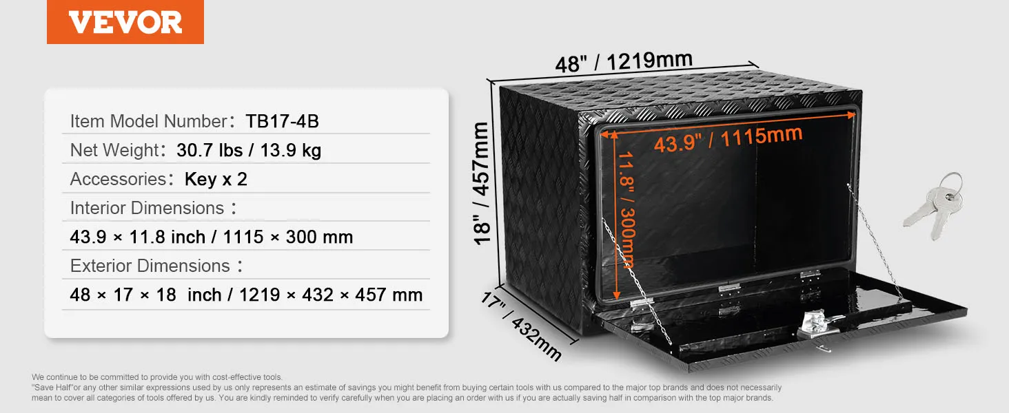 Install In No Time: This underbody truck box measures 48 x 17 x 18 inch/1219 x 432 x 457 mm, so make sure to measure your vehicle's underbody space before purchasing. VEVOR provides a variety of dimensions to meet your needs. You can also purchase brackets to install or do a DIY assembly yourself. Note that if you assemble the truck box on the vehicle, make sure to turn off the power to prevent a short circuit.