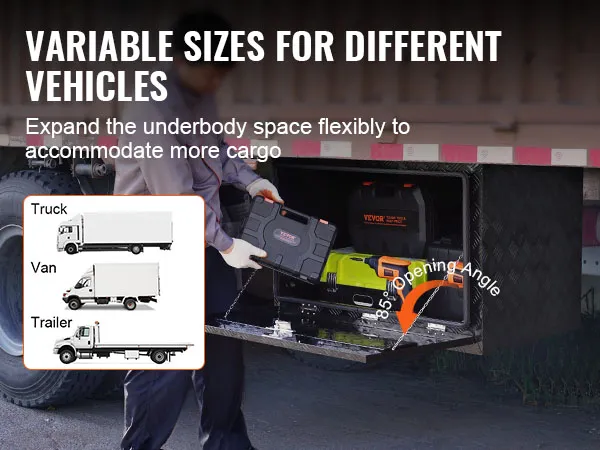 Are your items organized and easily accessible? VEVOR's underbody toolbox expands the storage space of your truck, trailer, or other large vehicles. You can store all your needs, from maintenance tools to camping equipment, in this truck box and keep everything organized.