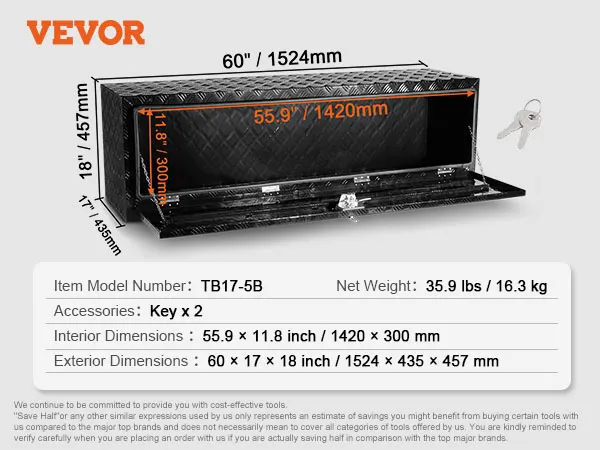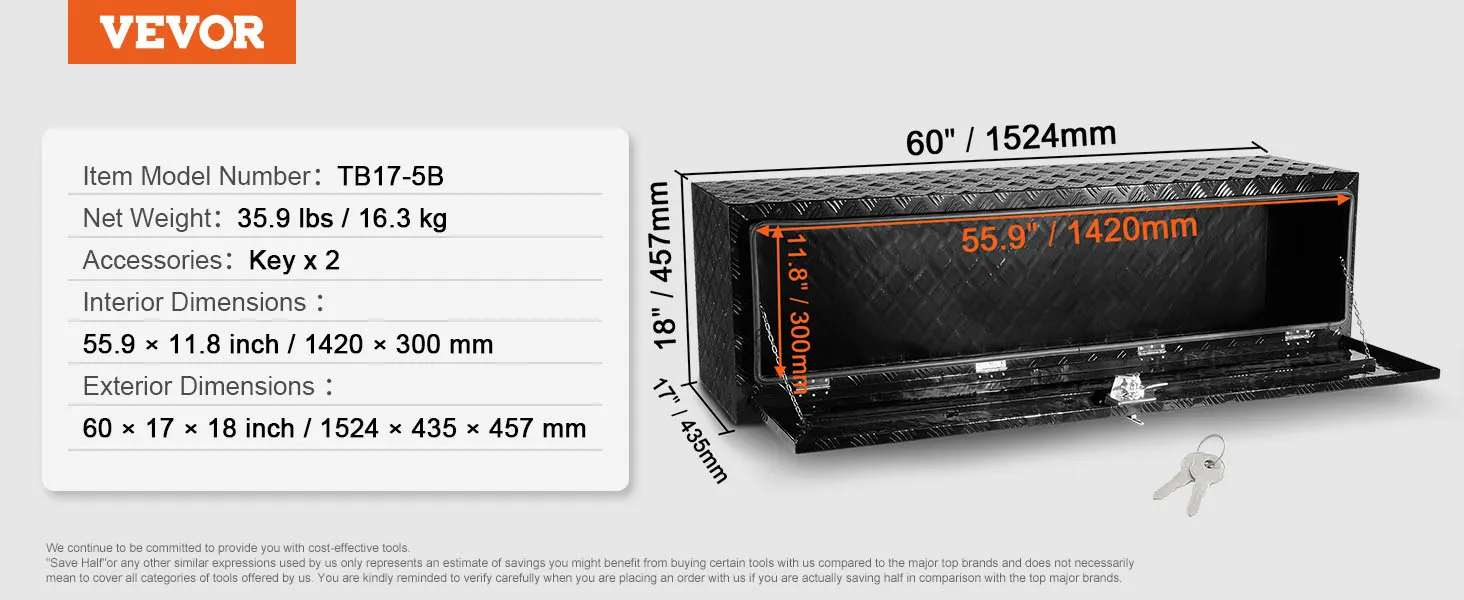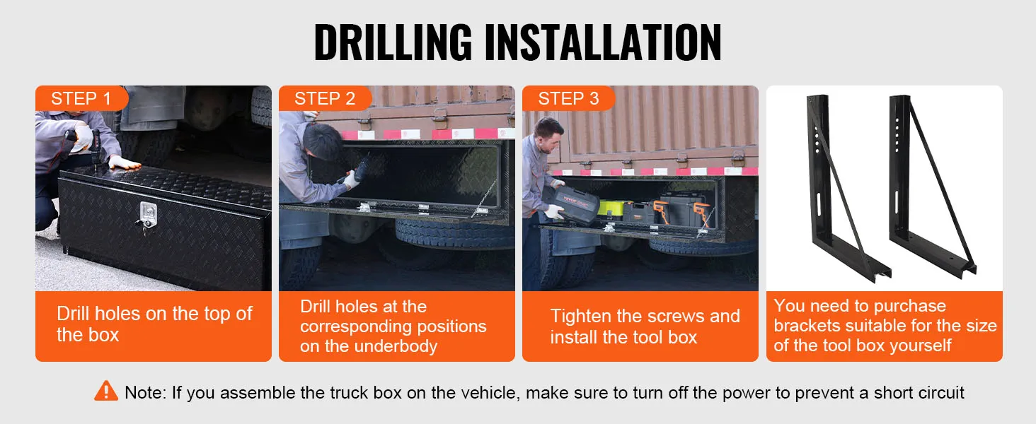 Install In No Time: This underbody truck box measures 60 x 17 x 18 inch/1524 x 432 x 457 mm, so make sure to measure your vehicle's underbody space before purchasing. VEVOR provides a variety of dimensions to meet your needs. You can also purchase brackets to install or do a DIY assembly yourself. Note that if you assemble the truck box on the vehicle, make sure to turn off the power to prevent a short circuit.