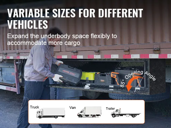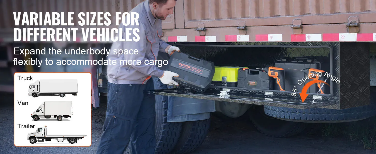 Are your items organized and easily accessible? VEVOR's underbody toolbox expands the storage space of your truck, trailer, or other large vehicles. You can store all your needs, from maintenance tools to camping equipment, in this truck box and keep everything organized.