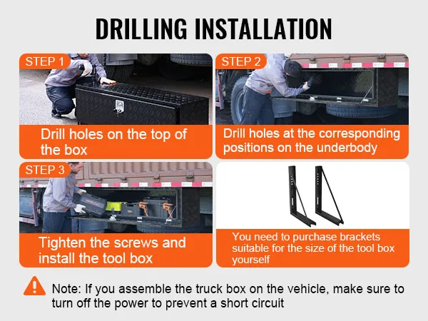 Before purchase, measure the space under your vehicle to choose from various sizes that meet your needs. You can purchase brackets for installation or assemble it yourself (DIY). Note that if you assemble the truck box on the vehicle, make sure to turn off the power to prevent a short circuit.