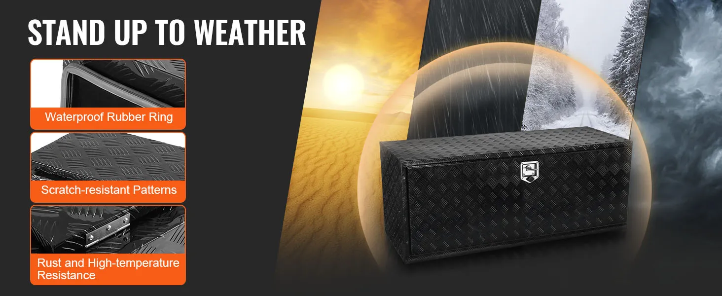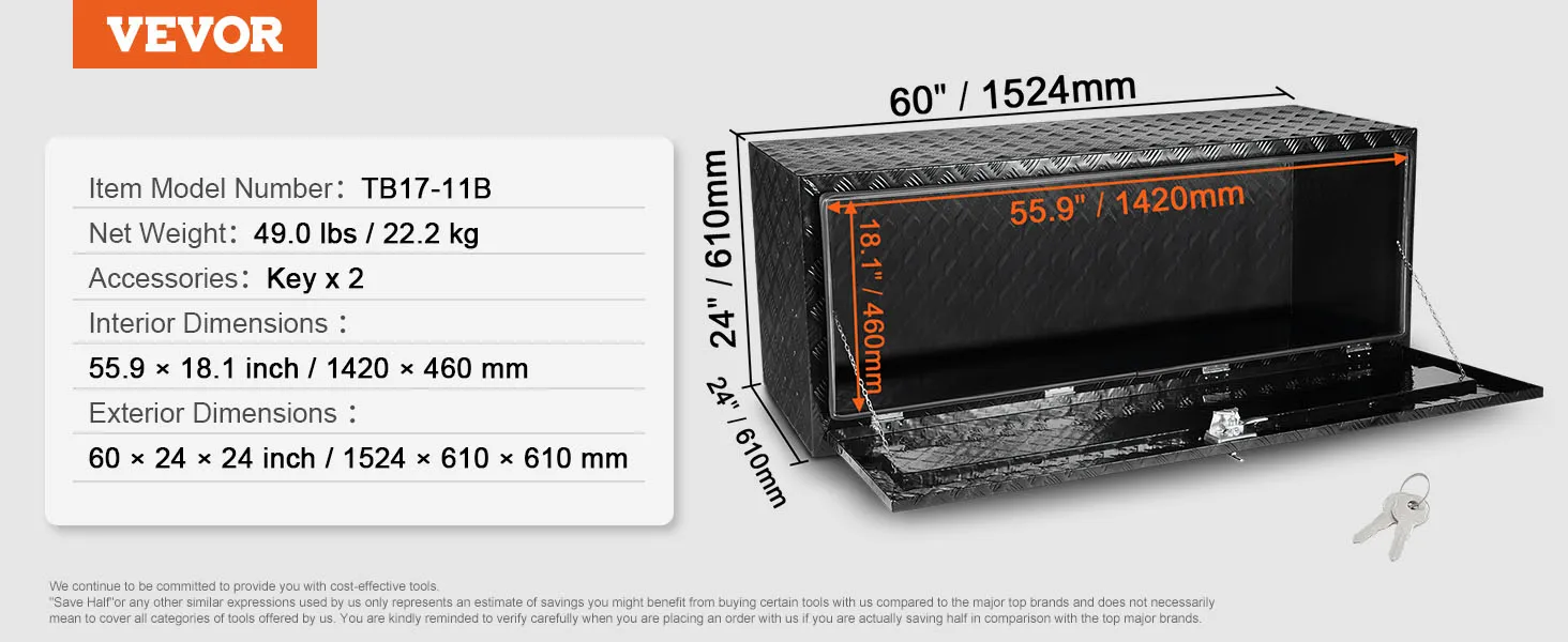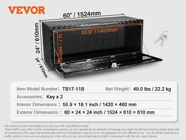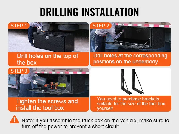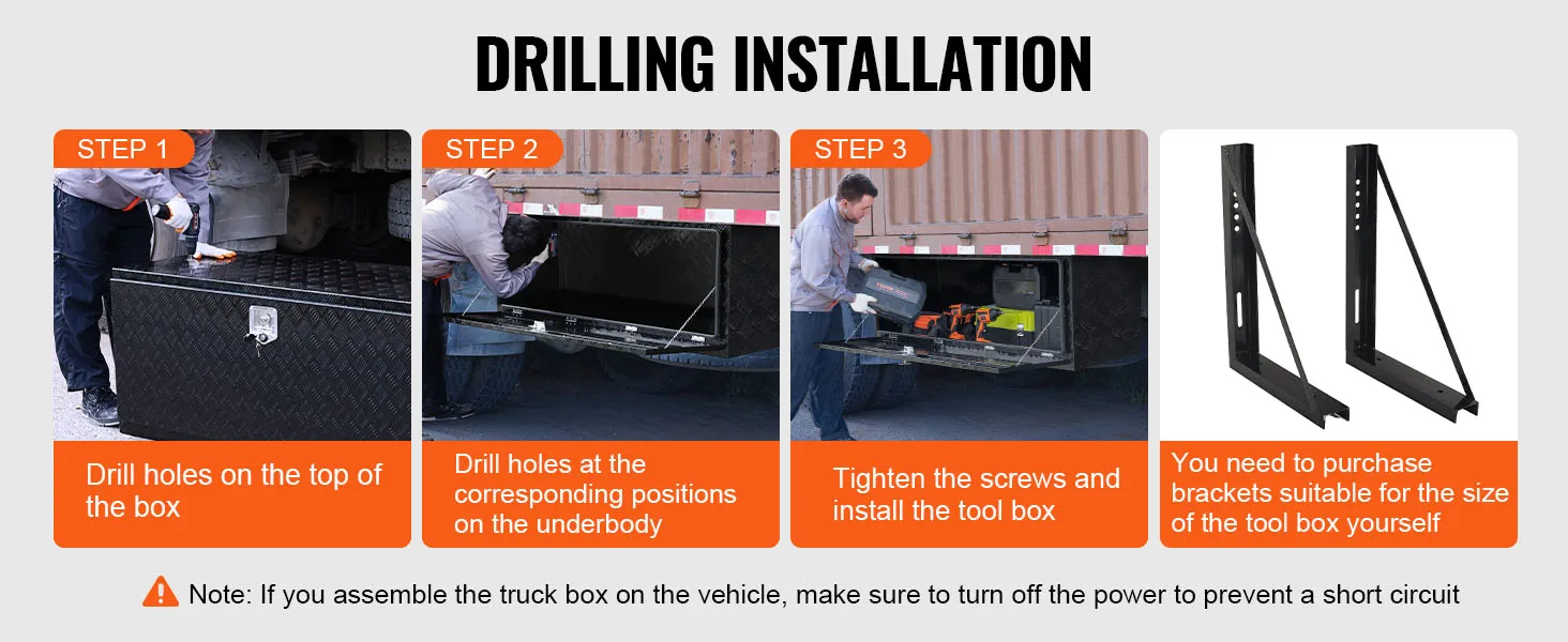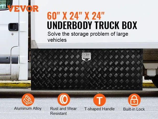 In een handomdraai in elkaar gezet: deze gereedschapskist meet 1524 x 610 x 610 mm (60 x 24 x 24 inch). Zorg er daarom voor dat u vóór de aankoop de bodemruimte van uw voertuig meet. VEVOR biedt verschillende afmetingen om aan uw behoeften te voldoen. U kunt ook beugels kopen voor montage of de montage zelf doen. Houd er rekening mee dat u bij het installeren van de vrachtwagenbox op het voertuig altijd de stroom moet uitschakelen om kortsluiting te voorkomen.