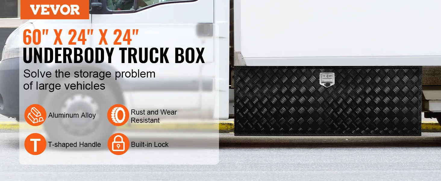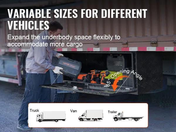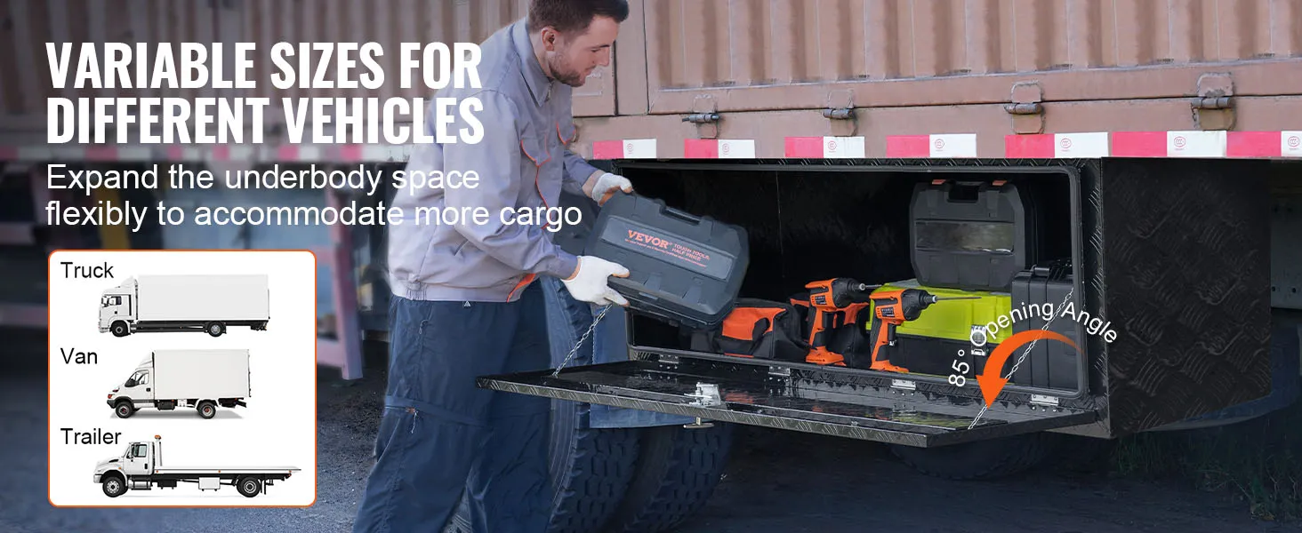 De VEVOR gereedschapskist voor onder de carrosserie breidt de opslagruimte van uw vrachtwagen, aanhanger of ander groot voertuig uit. Van onderhoudsgereedschap tot kampeerspullen, in deze gereedschapskist berg je alles netjes op.
