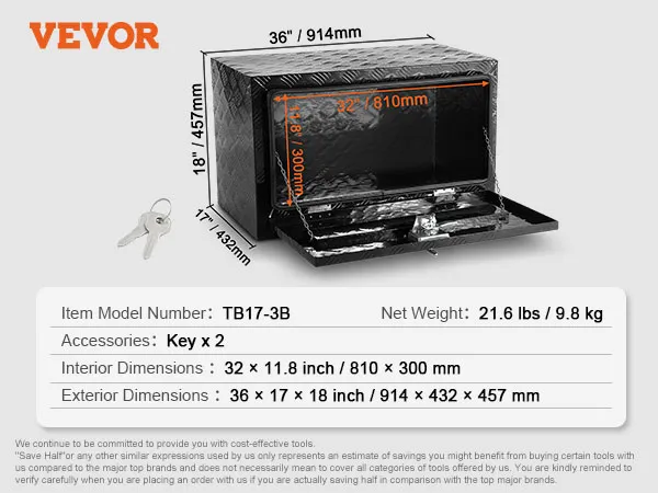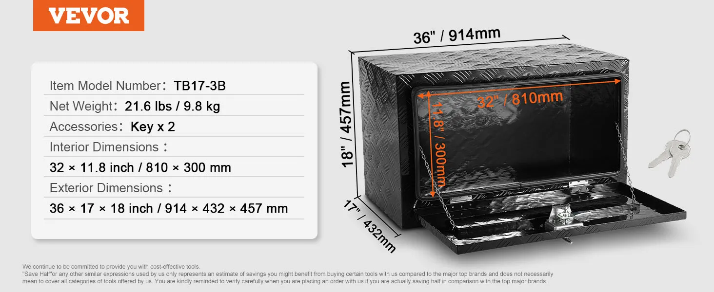 Install In No Time: This underbody truck box measures 36 x 17 x 18 inch/914 x 432 x 457 mm, so make sure to measure your vehicle's underbody space before purchasing. VEVOR provides a variety of dimensions to meet your needs. You can also purchase brackets to install or do a DIY assembly yourself. Note that if you assemble the truck box on the vehicle, make sure to turn off the power to prevent a short circuit.