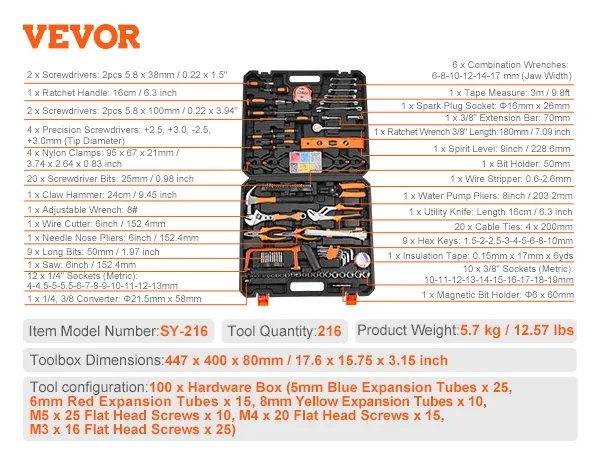 Met 216 onderdelen biedt deze gereedschapsset alles wat u nodig hebt voor onderhoud en reparaties in huis. De uitgebreide selectie zorgt ervoor dat u bent uitgerust voor taken van elke omvang, van kleine reparaties tot grotere projecten. Ontworpen om de noodzaak van meerdere sets te elimineren, biedt het gemak en efficiëntie, bespaart het tijd en geld en houdt het alle essentiële gereedschappen op één plek.