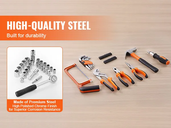 De gereedschappen in deze gereedschapsset voor thuisreparaties zijn gemaakt van hoogwaardig staal en zijn gebouwd om regelmatig gebruik te weerstaan en corrosie te weerstaan. De gepolijste chromen afwerking verbetert hun duurzaamheid, waardoor ze hun topprestaties in de loop van de tijd behouden. Deze stevige gereedschappen zijn ontworpen voor zowel alledaagse als professionele taken en vormen een waardevolle, langdurige aanvulling op elk huishouden of elke werkplaats.