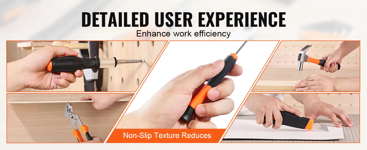 Elk gereedschap in deze DIY-projecten-gereedschapsset heeft een ergonomisch ontwerp voor comfortabele bediening. Antislipgrepen minimaliseren handvermoeidheid, waardoor langdurig gebruik zonder ongemak mogelijk is. Dit ontwerp zorgt voor betere controle en precisie, waardoor het gemakkelijker is om gedetailleerde of complexe taken uit te voeren. Geniet van verbeterde efficiëntie en comfort tijdens elke reparatie of elk project.