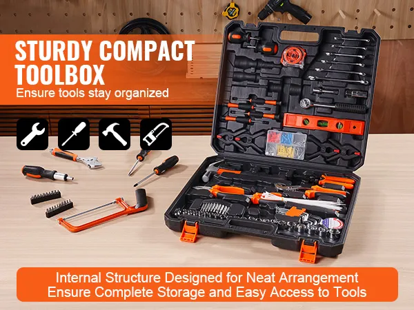 Deze algemene huishoudelijke handgereedschapset wordt geleverd met een draagbare gereedschapsopbergkoffer die uw gereedschap georganiseerd en veilig houdt. Het gestructureerde interieur zorgt ervoor dat elk gereedschap zijn plek heeft, waardoor u het juiste gereedschap gemakkelijk kunt vinden wanneer nodig. De compacte en lichte koffer zorgt voor moeiteloos transport en handige opslag, waardoor uw gereedschap veilig en klaar voor gebruik blijft.