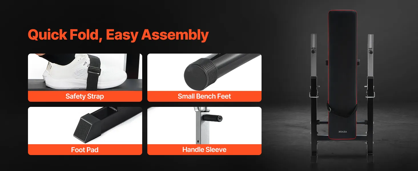 Deze praktische oefenbank heeft een opvouwbaar ontwerp dat eenvoudig te bevestigen is met de onderste bouten. In opgevouwen toestand bespaart hij 90% ruimte en is daarom ideaal voor kleine ruimtes.