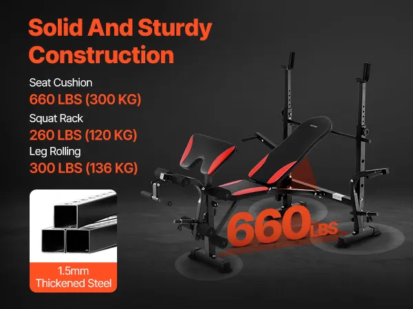 Stevig en duurzaam: deze halterbank is gemaakt van robuust staal van commerciële kwaliteit en is ontworpen om lang mee te gaan. Het ondersteunt gemakkelijk gebruikers met een gewicht tot 299 kg. De antislip rubberen voetjes voorkomen beschadigingen aan de vloer en zorgen ervoor dat de bank stabiel blijft tijdens gebruik.