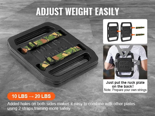 Easily adjust your training intensity from 10 lbs to 20 lbs. The side holes let you add or combine plates with straps, offering a flexible and secure way to customize your weight.