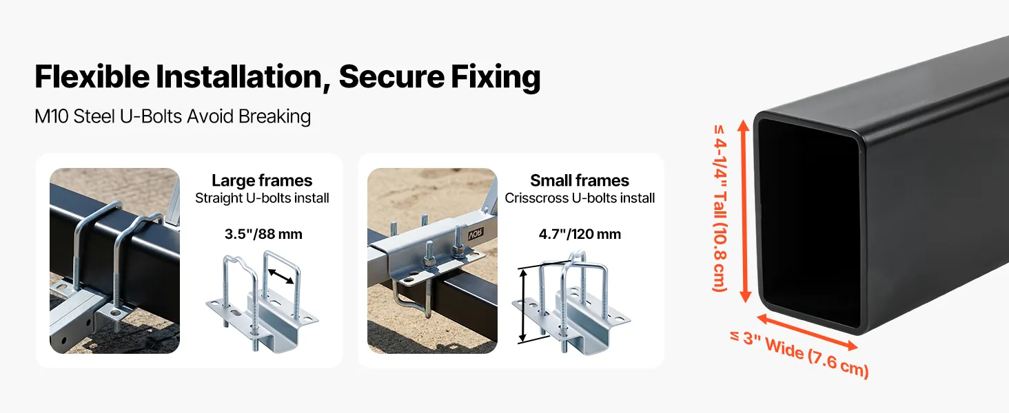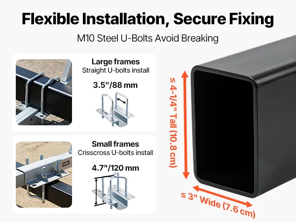 Twee montagemogelijkheden: Geschikt voor aanhangerframes tot 7,6 cm breed en 10,8 cm hoog. Kies uit twee veilige montagemethoden voor grote of kleine aanhangerrekken. Inclusief robuuste M10 U-bouten die zorgen voor een permanente, veilige bevestiging en niet losraken of breken.