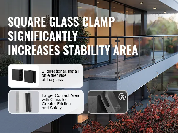 In tegenstelling tot U-vormige glasklemmen heeft deze vierkante klem twee openingen voor een betere grip en een hoog draagvermogen. Het vierkante ontwerp biedt een groter contactoppervlak voor meer stabiliteit en veiligheid.