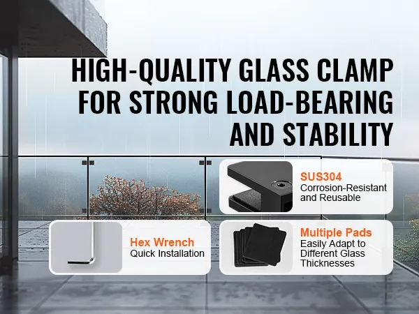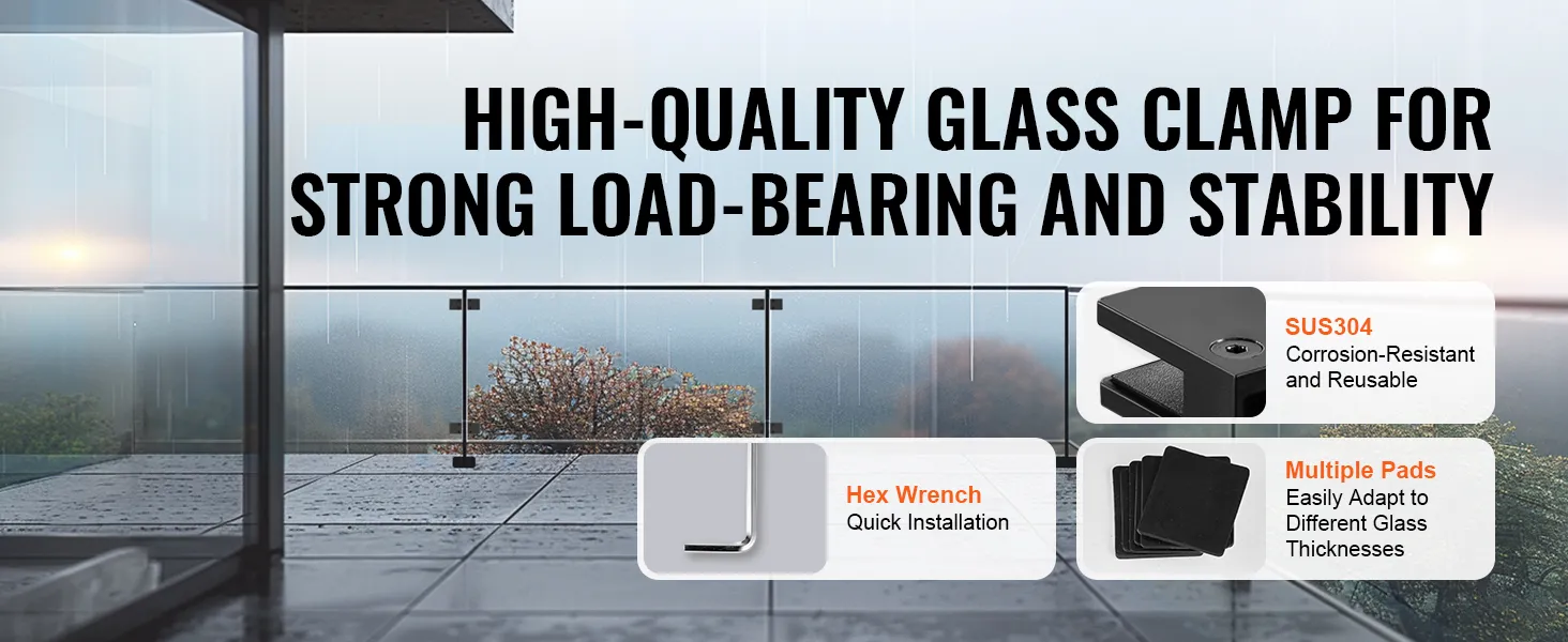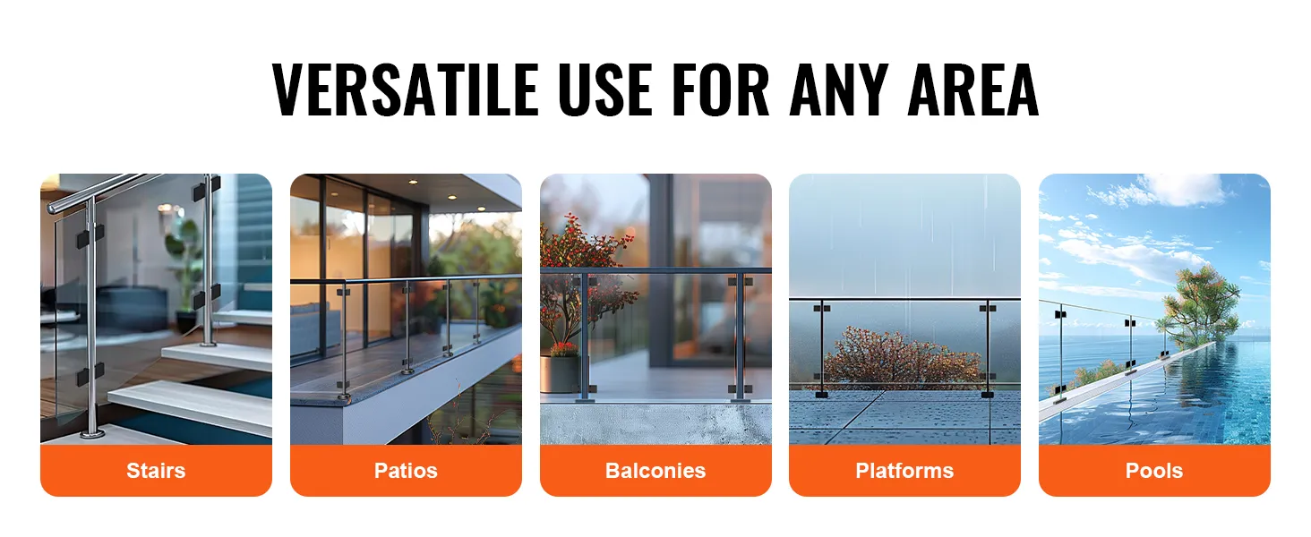 De VEVOR glazen balustradebeugel biedt hoge sterkte en stabiliteit. Roestvrij staal met hoge hardheid 304 vormt zowel de algehele constructie als de verbindingsschroeven. Het zorgt voor de stabiliteit van frameloze glasinstallaties. De beugel vermindert trillingen veroorzaakt door sterke wind. Het maakt het geschikt voor buitenomgevingen. De sterke constructie houdt het glas stevig op zijn plaats, voorkomt ongewenste beweging en verbetert de veiligheid. Stabiele montage zorgt voor een veilige en betrouwbare installatie. Deze eigenschap maakt het een betrouwbare keuze voor zowel thuis- als commercieel gebruik.