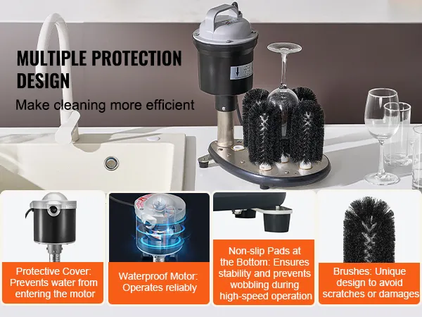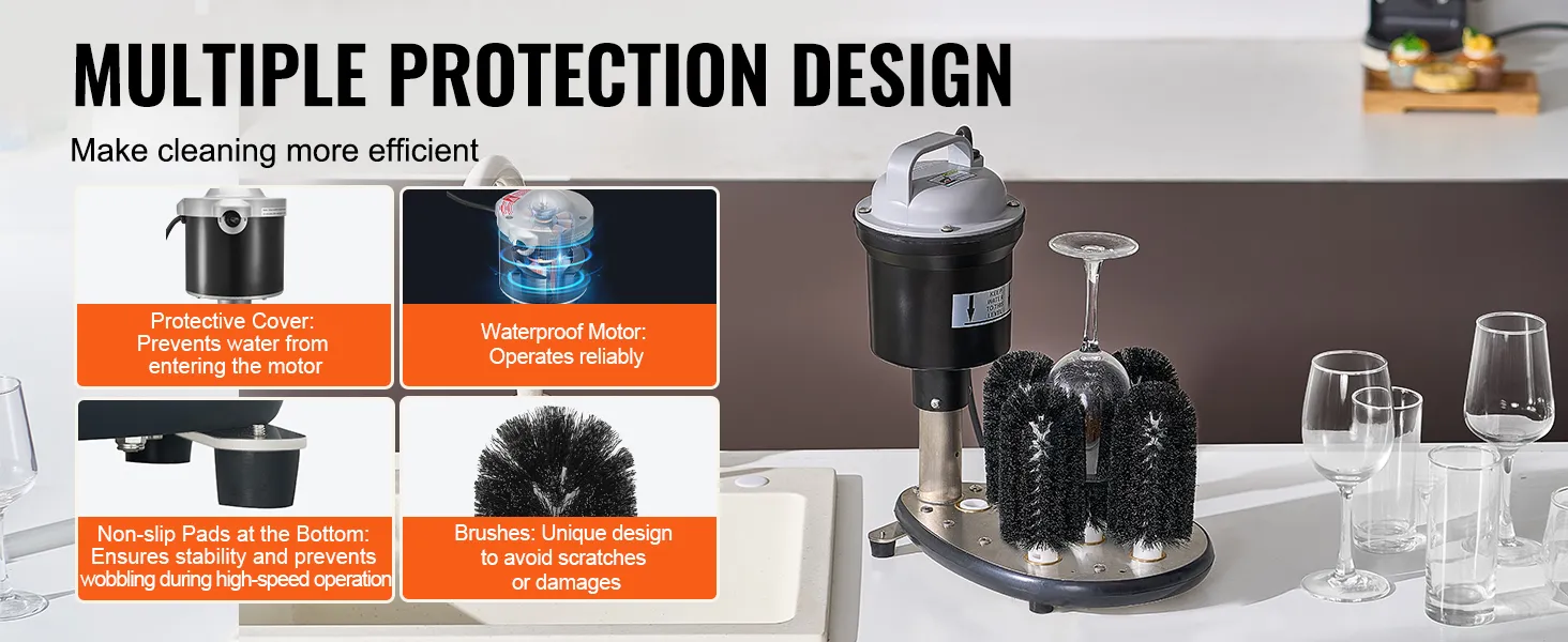 Designed with several secure features, this electric glass washer includes an efficient protective cover to prevent water from entering the motor, durable stainless steel material to resist aging, non-slip pads at the bottom for stability during high-speed operation.