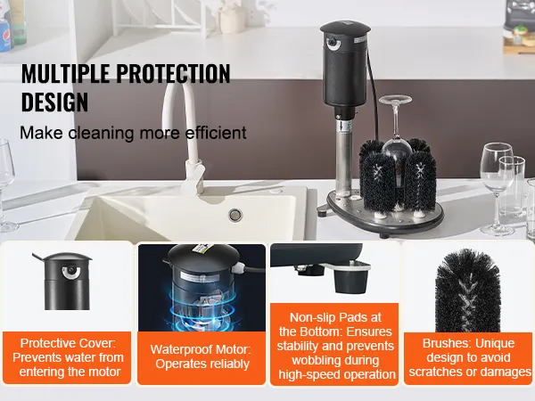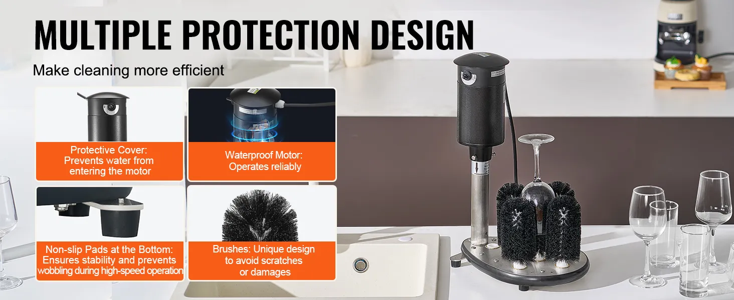 Designed with several secure features, this electric glass washer includes an efficient protective cover to prevent water from entering the motor, durable stainless steel material to resist aging, non-slip pads at the bottom for stability during high-speed operation.