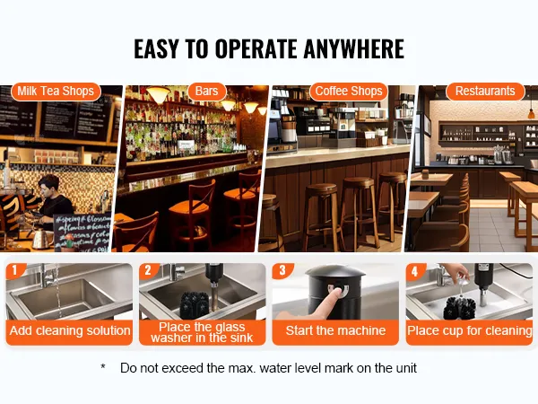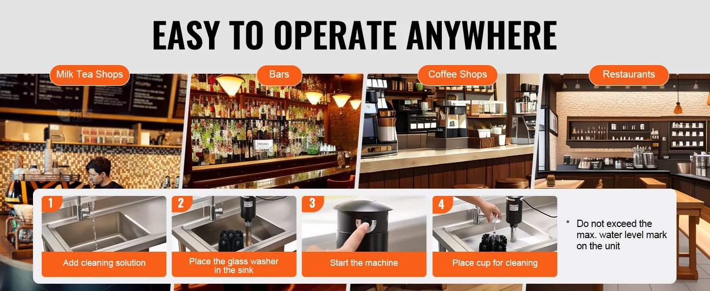 The electric glass washer allows for easy operation anytime and anywhere. Whether in a busy bubble tea shop, a vibrant bar, a cozy cafe, or various dining establishments, it’s the perfect tool to enhance your efficiency.