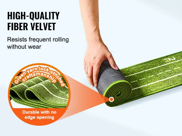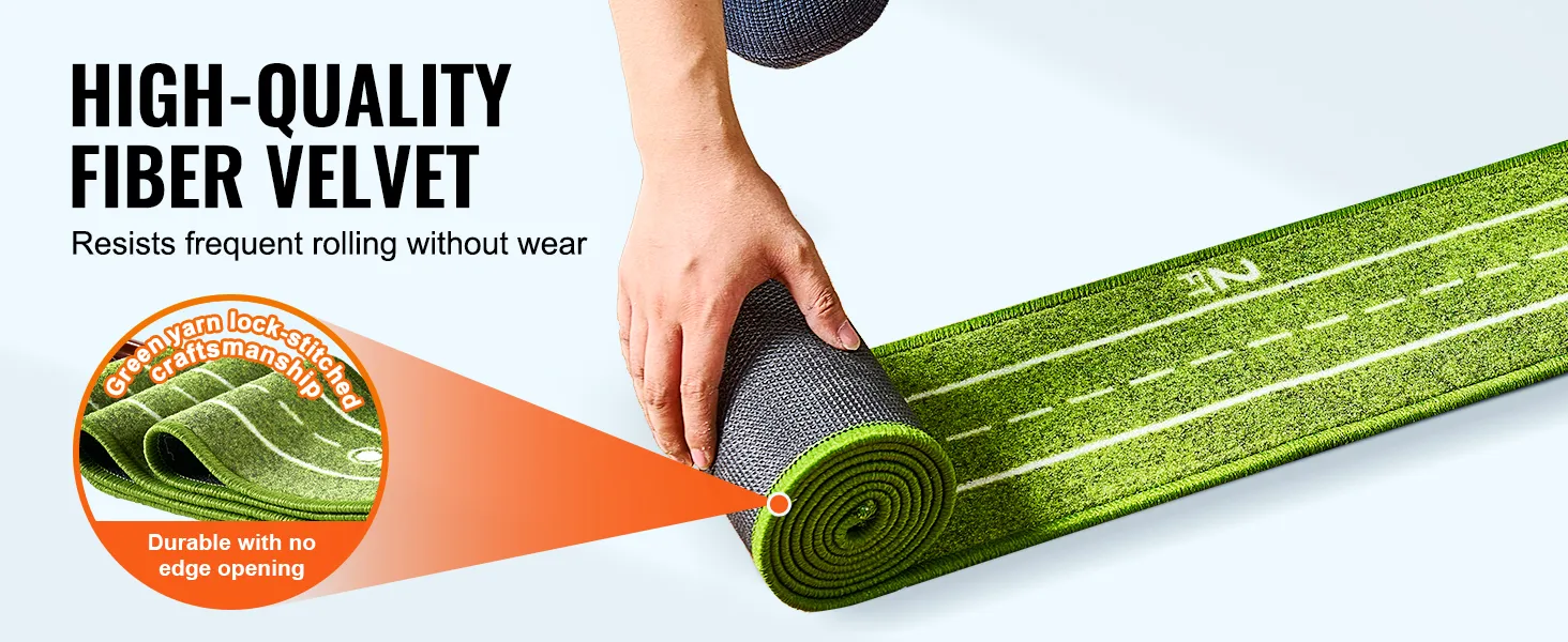 Rimpelvrij vezelfluwelen tapijt: onze golfmat is gemaakt van hoogwaardig vezelfluwelen tapijt en heeft een fijner en zachter oppervlak in vergelijking met andere matten, waardoor de zichtbaarheid van uitlijnings- en afstandslijnen wordt verbeterd. De antislip TPE-basis voorkomt rimpels en zorgt voor een stabiel golfbalpad voor een realistische en stabiele putervaring.