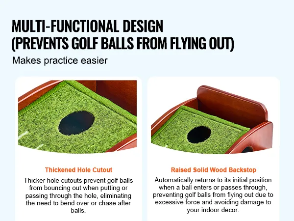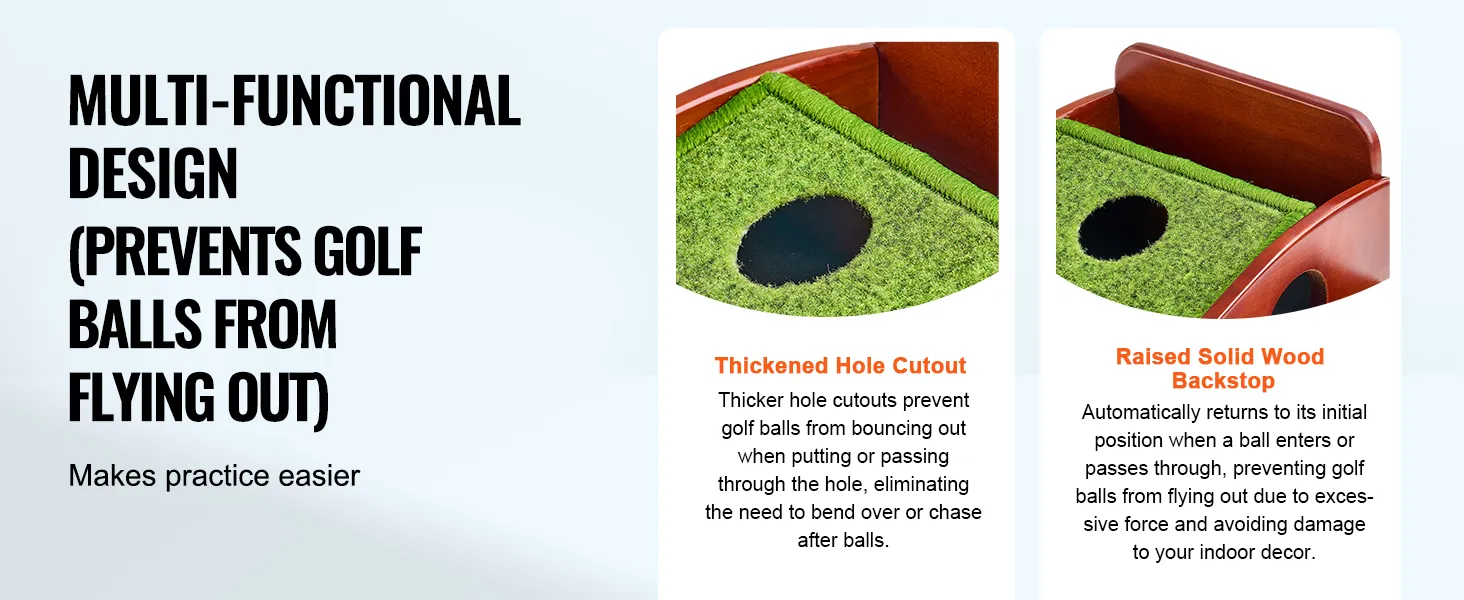 Continu en efficiënt putten: het automatische balterugvoersysteem in combinatie met de verhoogde houten backstops en verzonken gatuitsparingen voorkomen dat golfballen van de mat vliegen. Wanneer een bal een hole binnengaat of passeert, raakt hij de rebound en keert hij automatisch terug naar zijn startpositie. De houten basis en het frame zijn duurzaam en esthetisch aantrekkelijk.