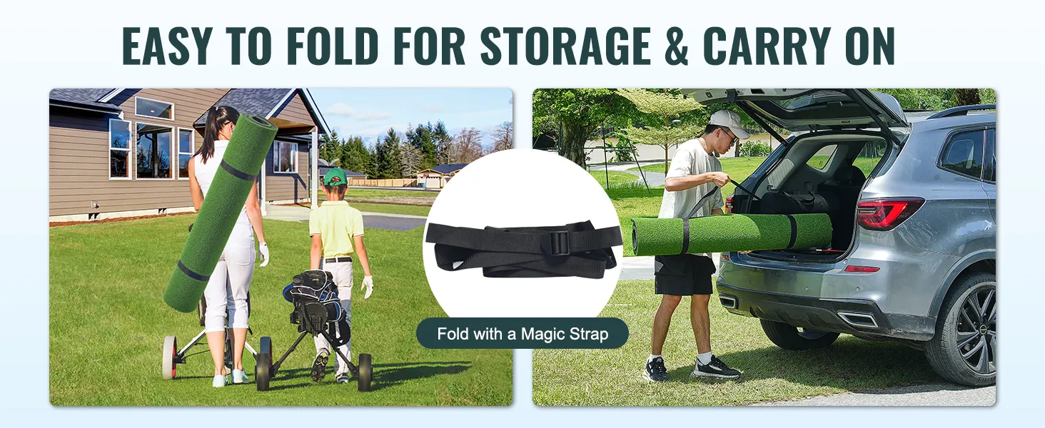 Onze indoor golfslagmat stelt comfort voorop. Dankzij het opvouwbare ontwerp en de meegeleverde Magic Strap is hij gemakkelijk te vervoeren en op te bergen, zodat je altijd en overal je swing kunt oefenen.