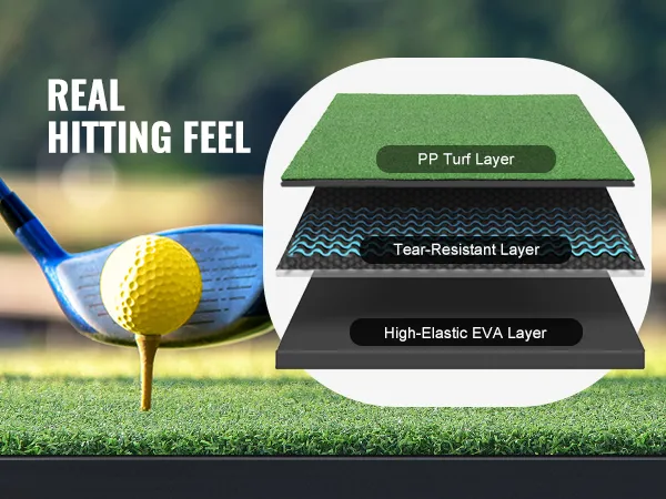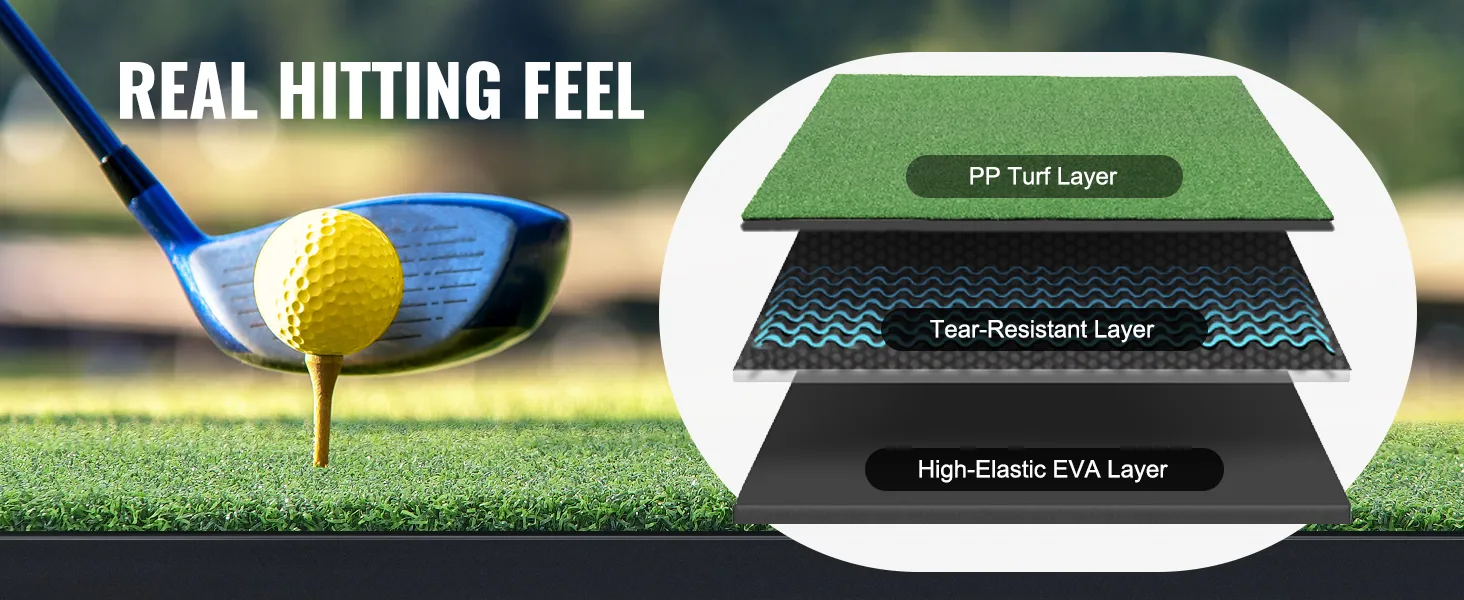 6 gaten voor rubberen tees: deze buitengolfmat is ontworpen met zes gaten voor rubberen tees voor rechts- en linkshandige golfers. Je kunt ze in verschillende richtingen gebruiken om te voorkomen dat ze zacht inzakken als gevolg van langdurig op één plek staan.