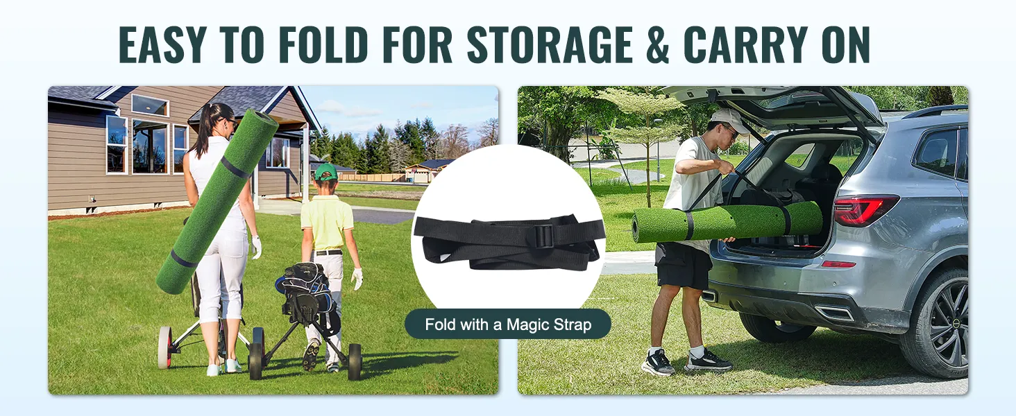 Onze indoor golfslagmat stelt comfort voorop. Dankzij het opvouwbare ontwerp en de meegeleverde Magic Strap is hij gemakkelijk te vervoeren en op te bergen, zodat je altijd en overal je swing kunt oefenen.