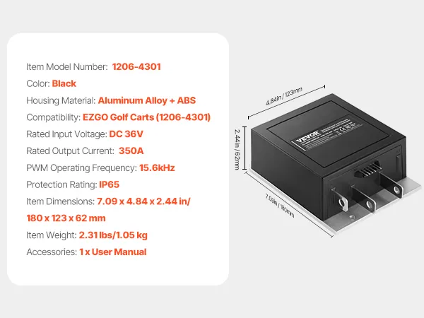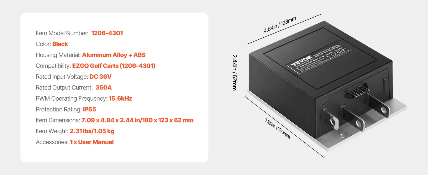 Our golf cart controller fits EZGO 1206-4301 models, giving plug-and-play ease. With 36V input and 350A output, IP65 waterproof, and aluminum alloy & ABS housing, it ensures your peace of mind driving. Quick start and 15.6kHz high-frequency response boost efficiency and performance.