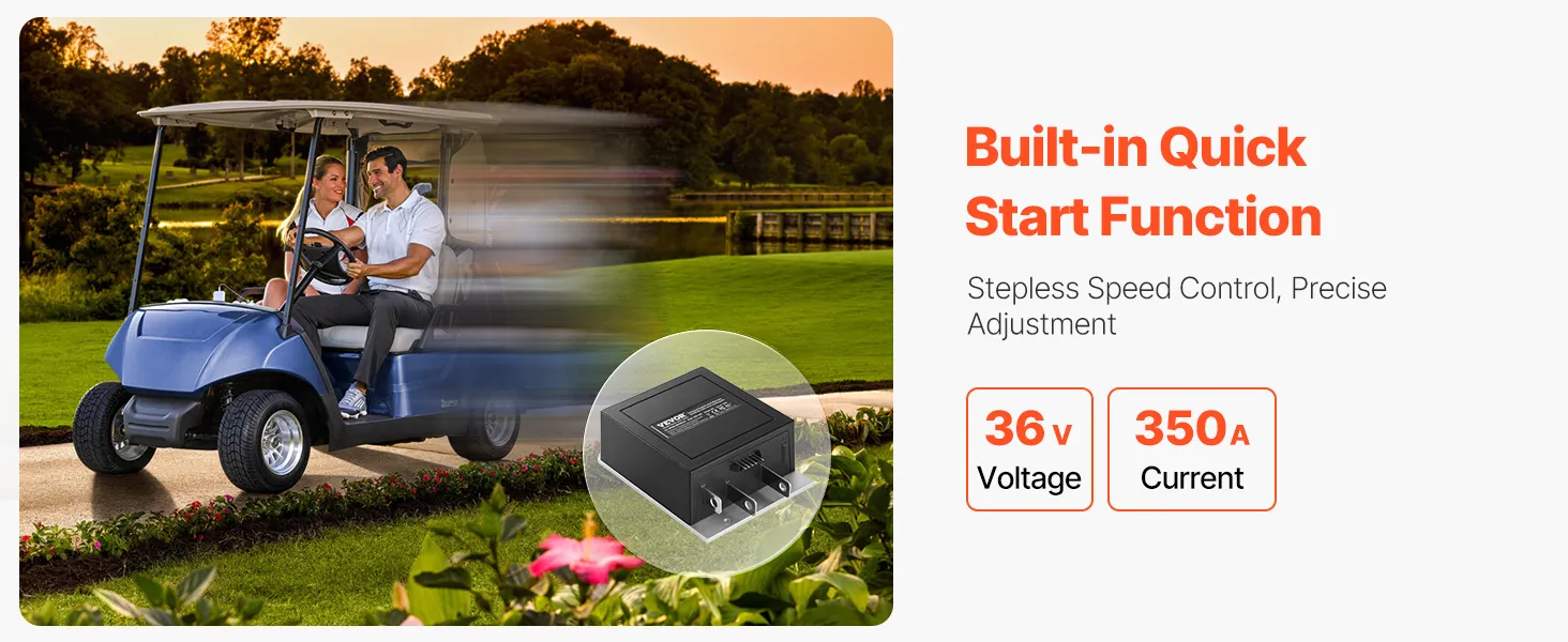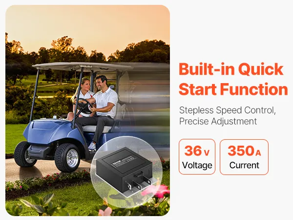 This golf cart motor controller features a quick start for instant throttle response and seamless acceleration. With 36V input and 350A output, it ensures smooth, efficient driving and precise speed control.