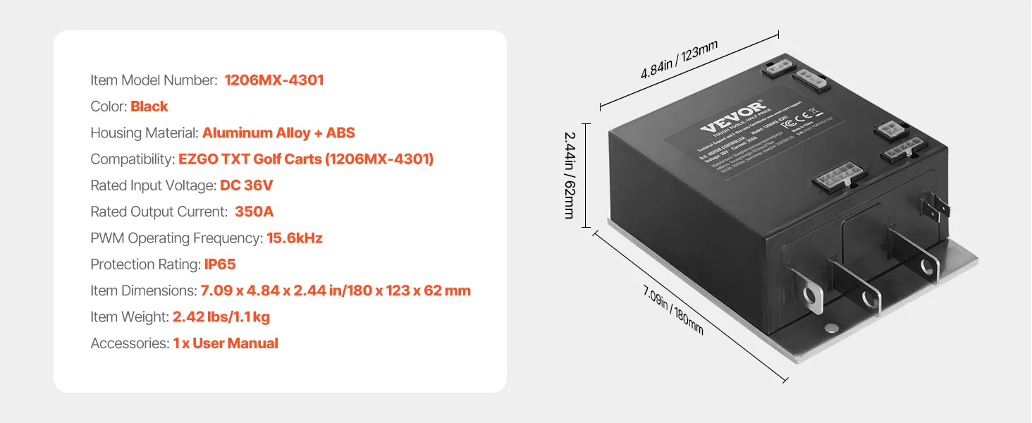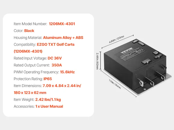 Our golf cart controller fits EZGO TXT 1206MX-4301 models, giving plug-and-play ease. With 36V input and 350A output, IP65 waterproof, and aluminum alloy & ABS housing, it ensures your peace of mind driving. Quick start and 15.6kHz high-frequency response boost efficiency and performance.