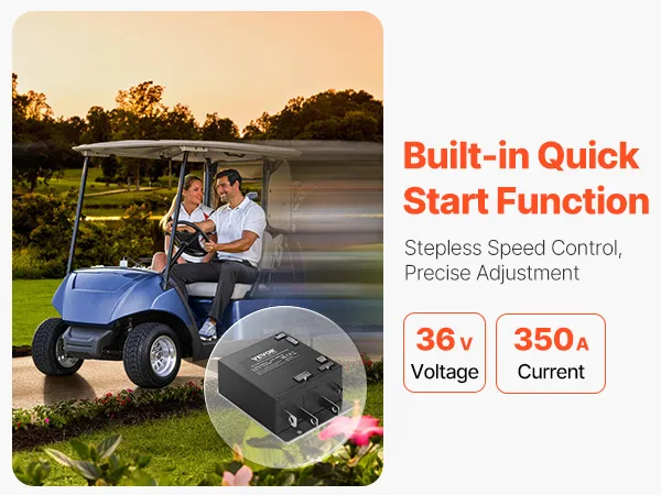 This golf cart motor controller features a quick start for instant throttle response and seamless acceleration. With 36V input and 350A output, it ensures smooth, efficient driving and precise speed control.