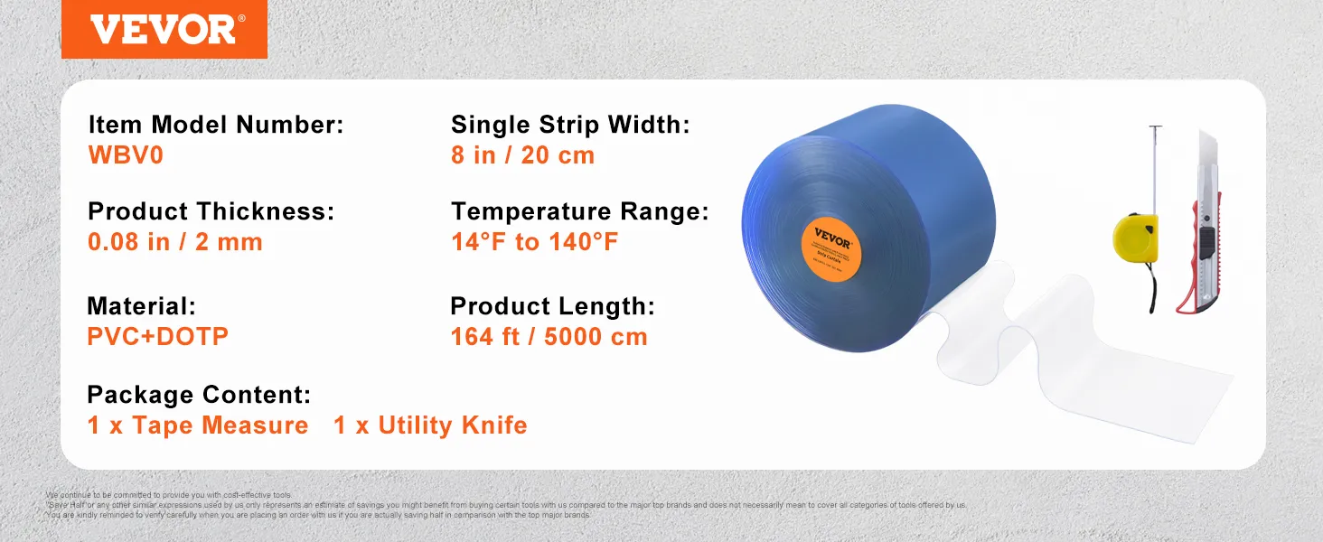 VEVOR Strip Curtain, 164' Length x 8" Width x 0.08" Thickness, Clear PVC Smooth Curtain Strip Door Bulk Roll, Plastic Door Strips for Doorways of Supermarket, Garage, Warehouse, Barn, Pet Animal House