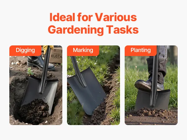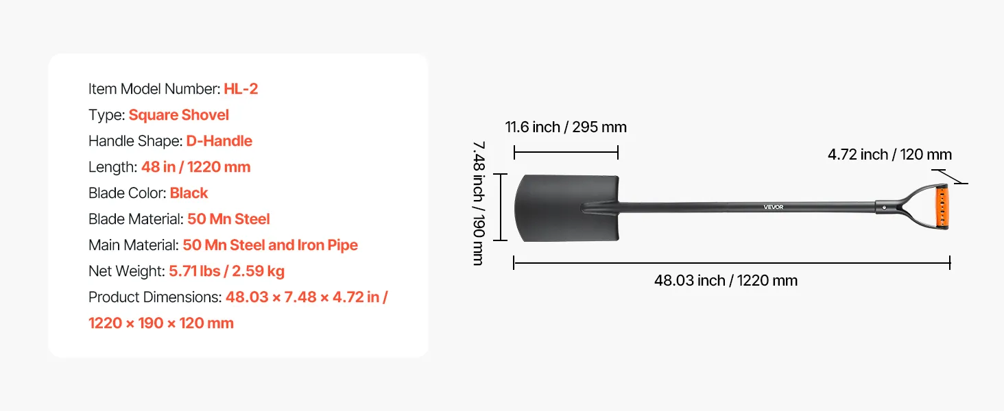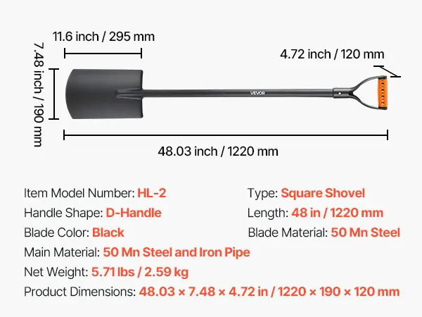 Lichtgewicht: Onze vierkante tuinschep is 122 cm lang en heeft een metalen blad van 19 x 29,5 cm, een perfecte combinatie van proporties en efficiëntie. Met een gewicht van slechts 2,6 kg vermindert hij de inspanning bij langdurig gebruik.