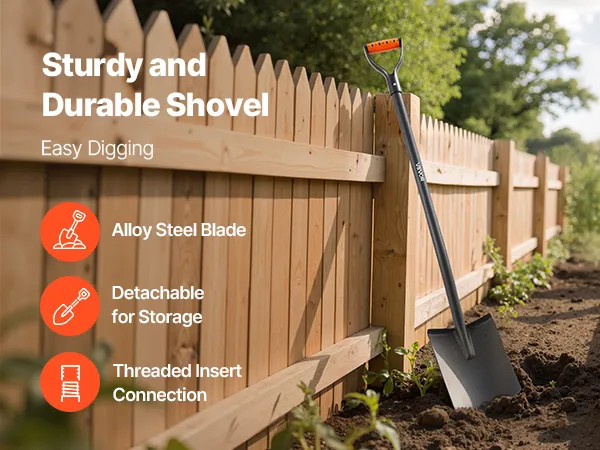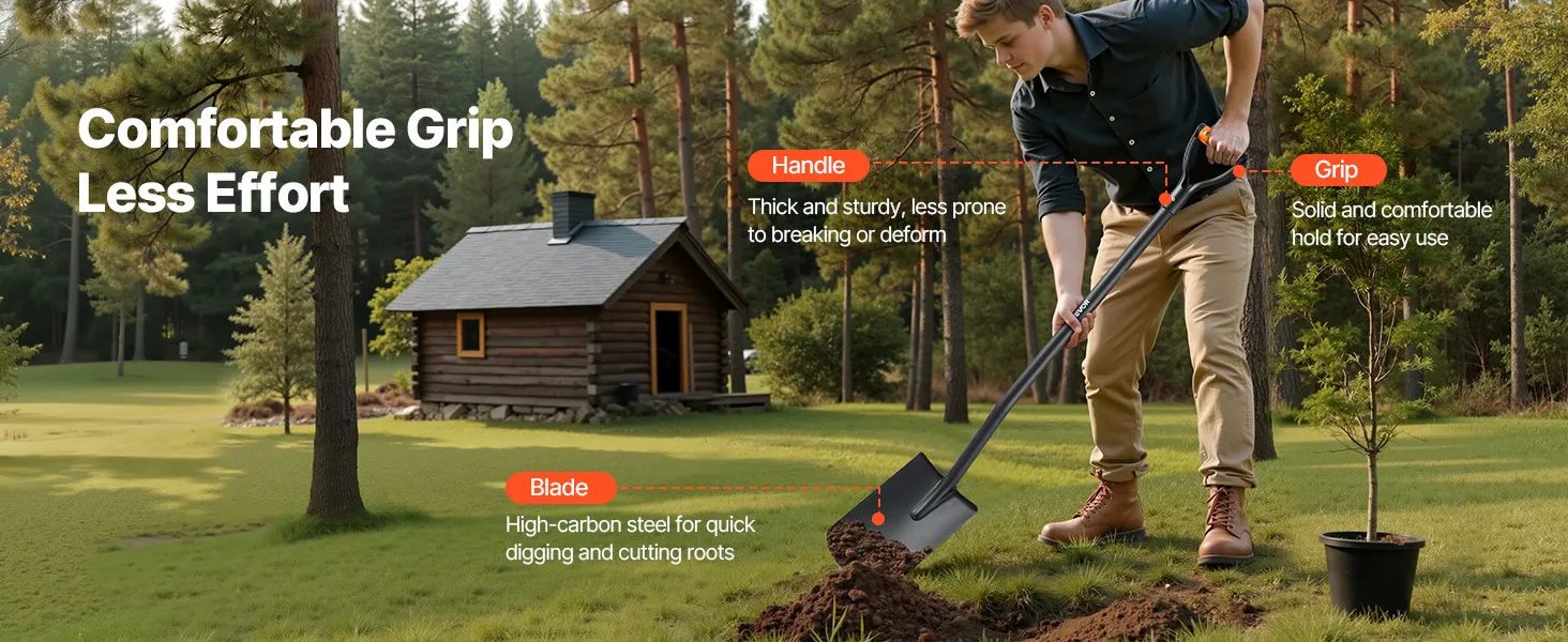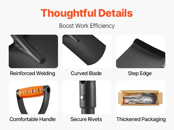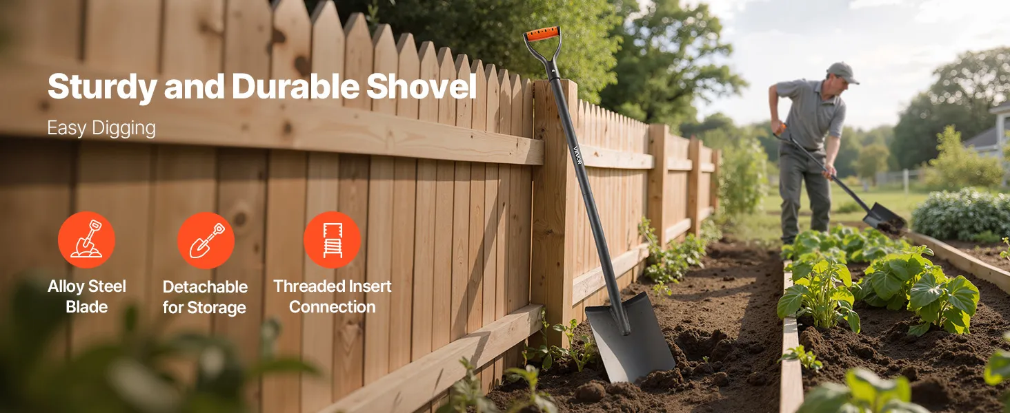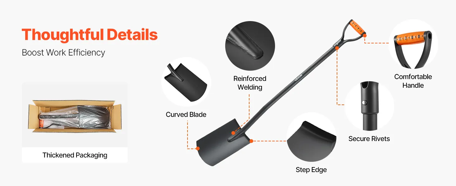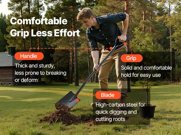 Robuust ontwerp: Deze tuinspade heeft een gelast ontwerp met een draaivergrendeling, wat de graafefficiëntie verhoogt en zorgt voor een snelle demontage voor opslag. De ergonomische D-handgreep biedt comfort en vermindert vermoeidheid.