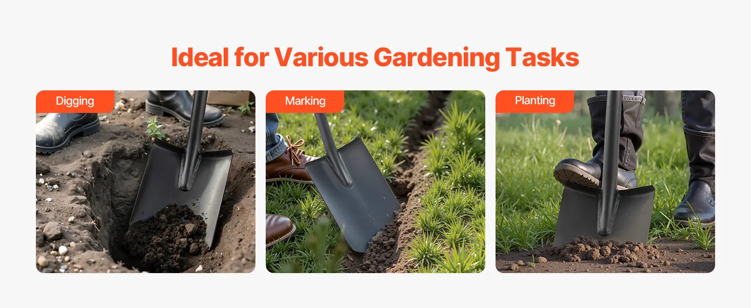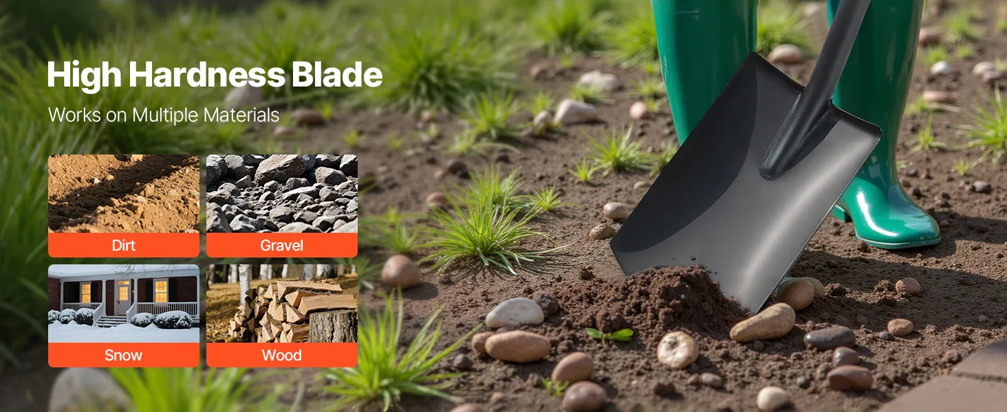 Onze tuinspade kenmerkt zich door zijn hoge hardheid en is geschikt voor diverse graafwerkzaamheden, zoals het aanplanten van tuinen, het maken van randen, het graven van sleuven en het sneeuwvrij maken van opritten. Hij is ideaal voor landschapsarchitectuur, kamperen en landbouw.