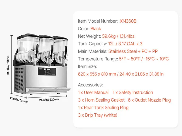 Extra kenmerken: De slushmachine is voorzien van een lekbak aan de onderkant om waterlekkage te voorkomen. Deze kan worden verwijderd voor eenvoudige reiniging. De veerbelaste kraan zorgt voor minimale waterlekkage na gebruik. Het driezijdige ventilatieontwerp zorgt voor een snelle warmteafvoer en de rubberen voetjes zorgen voor antislipstabiliteit tijdens het gebruik, waardoor een betere machinestabiliteit wordt gegarandeerd.