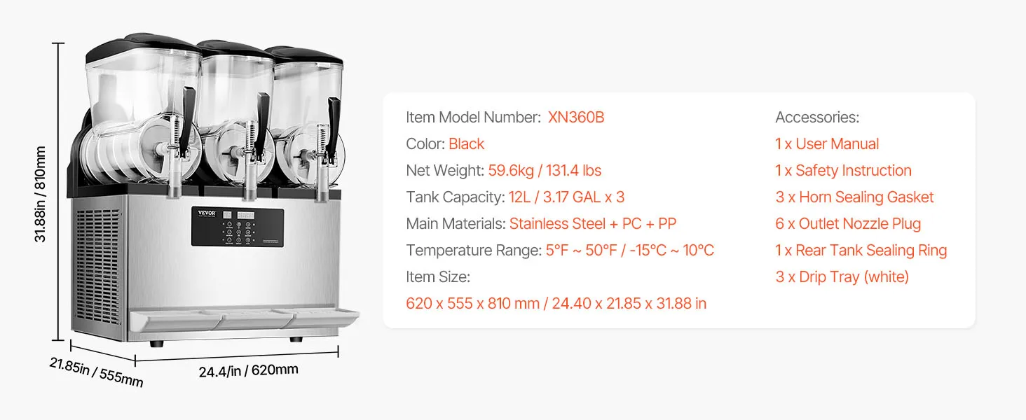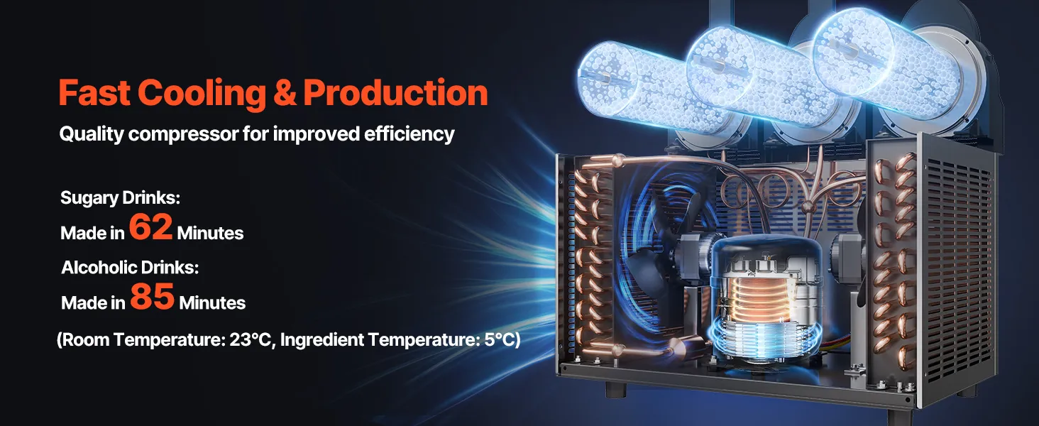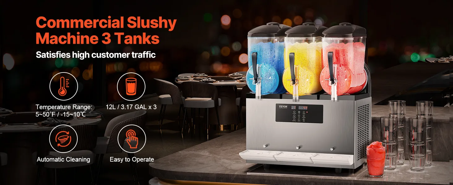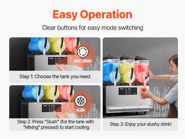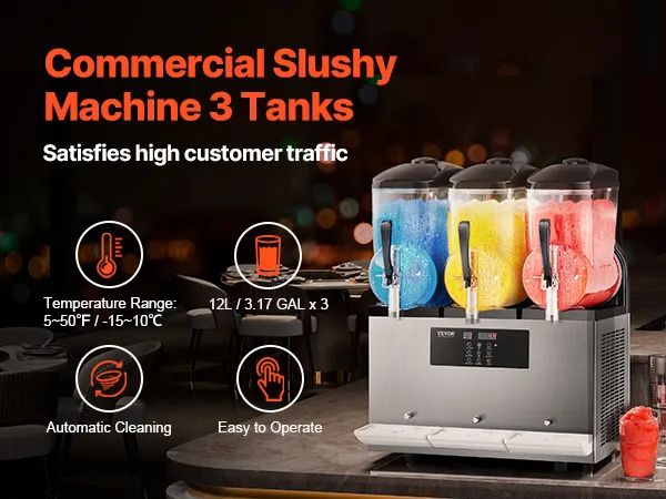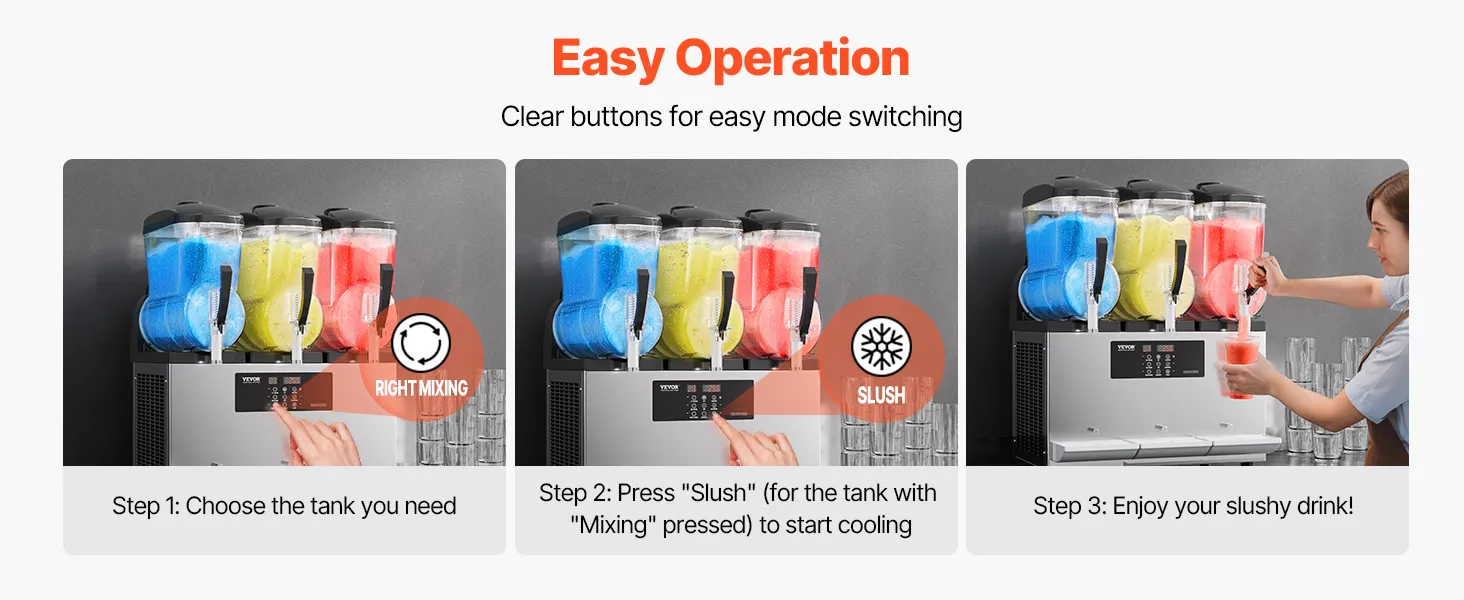 3 tanks met onafhankelijke instellingen: Met drie tanks met een capaciteit van 12 liter kan deze slushmachine ongeveer 144 kopjes slushdranken per batch maken. Je kunt elke tank afzonderlijk gebruiken. Het vereist minder vaak bijvullen, waardoor het perfect is voor commercieel gebruik met veel verkeer.