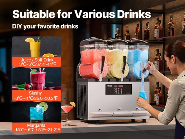 VOOR VERSCHILLENDE DRANKEN: Deze verbeterde commerciële slushmachine beschikt over een instelbaar temperatuurbereik van 5 tot 50 °F (-15 tot 10 °C), zodat u de zachtheid of hardheid van uw drankjes kunt regelen. Voor koude dranken: 37,4 tot 41 °F (3 tot 5 °C); voor niet-alcoholische slushdranken: 26,6 tot 30,2 °F (-3 tot -1 °C); voor alcoholische dranken: -15 tot -6°C/5 tot 21,2°F. (Aanbevolen suikergehalte: ca. 13%, alcoholgehalte: minder dan 13%).