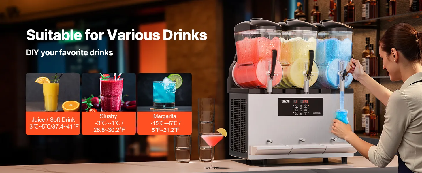 De verbeterde slushmachine heeft een temperatuurregelbereik van -15 tot 10°C, waardoor hij geschikt is voor een verscheidenheid aan dranken, waaronder sappen, ijskoffie, thee en zelfs margarita's.
