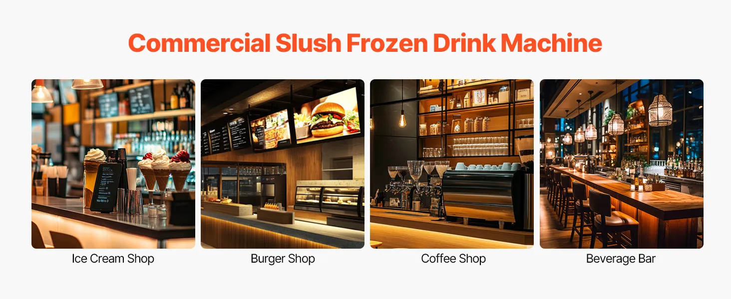 Deze slushmachine is ideaal voor gebruik in commerciële omgevingen zoals ijssalons, hamburgerwinkels, cafés, bars en kleine kraampjes en is perfect voor ruimtes met veel verkeer.