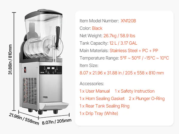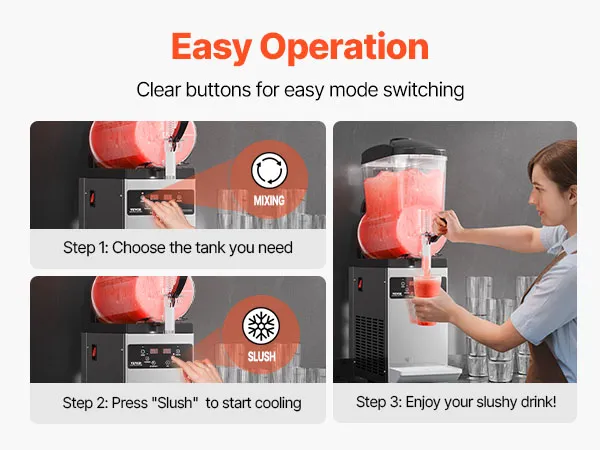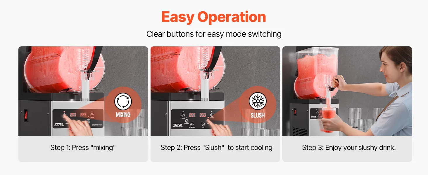Extra kenmerken: De slushmachine is voorzien van een lekbak aan de onderkant om waterlekkage te voorkomen. Deze kan worden verwijderd voor eenvoudige reiniging. De veerbelaste kraan zorgt voor minimale waterlekkage na gebruik. Het driezijdige ventilatieontwerp zorgt voor een snelle warmteafvoer en de rubberen voetjes zorgen voor antislipstabiliteit tijdens het gebruik, waardoor een betere machinestabiliteit wordt gegarandeerd.