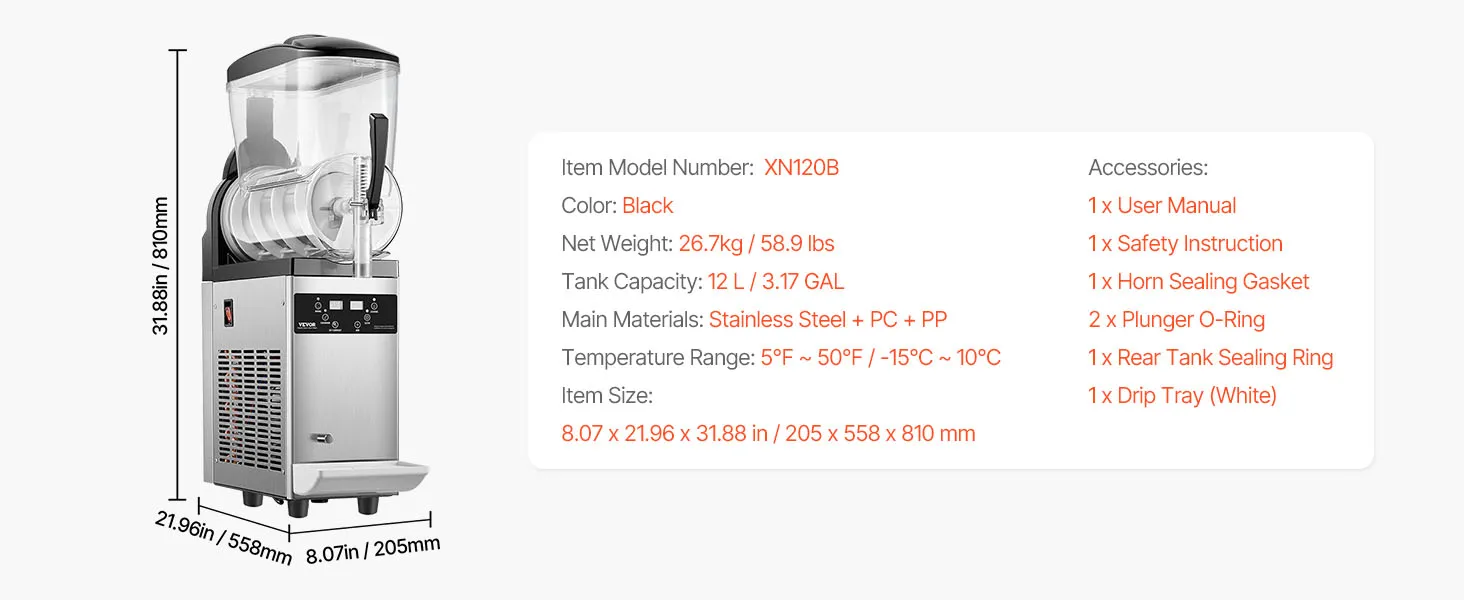 Deze commerciële slushmachine heeft een tank van 12 liter, roestvrijstalen behuizing en PC-tank en is gemaakt van duurzame en gezonde materialen.