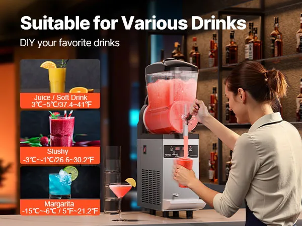 VOOR VERSCHILLENDE DRANKEN: Deze verbeterde commerciële slushmachine beschikt over een instelbaar temperatuurbereik van 5 tot 50 °F (-15 tot 10 °C), zodat u de zachtheid of hardheid van uw drankjes kunt regelen. Voor koude dranken: 3 tot 5°C (37,4 tot 41°F); voor alcoholvrije slushdranken: -3 tot -1 °C (26,6 tot 30,2 °F); voor alcoholische dranken: -15 tot -6 °C (5 tot 21,2 °F). (Aanbevolen suikergehalte: ca. 13%, alcoholgehalte: minder dan 13%).
